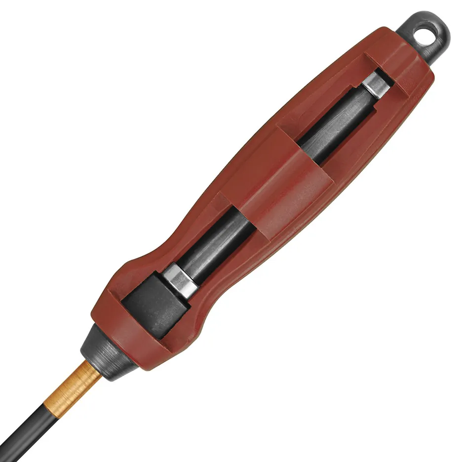 Carbon fiber is well-suited to the tough tasks assigned to cleaning rods. It combines the best features of stainless steel and coated cleaning rods, then adds valuable properties of its own. During Operation Iraqi Freedom, US military armorers called on Tipton to provide cleaning rods that would clean service rifles in demanding conditions. It made sense to us: Carbon fiber is an ideal material for cleaning rods. Stainless steel rods can scratch or wear barrels if they're used carelessly - though they won't pick up potentially damaging small abrasive particles. "Coated" rods get part of the job done - they keep the stainless steel shaft from damaging your barrel's rifling, but the coating will pick up small abrasive particles, which means you're effectively running fine-grit sandpaper through your bore. Carbon fiber rods are the best of both: the carbon fiber can't scratch your bore like stainless steel, and they won't embed like coated rods. We call these cleaning rods "deluxe" because they feature an ergonomically designed handle that spins on two sets of ball bearings - the result is a cleaning rod that smoothly follows the rifling both pushing and pulling, even while under pressure. The "shank-through" construction also allows the user to apply "reasonable" hammer blows to the end of the cleaning rod to get a tight patch through a bore.
