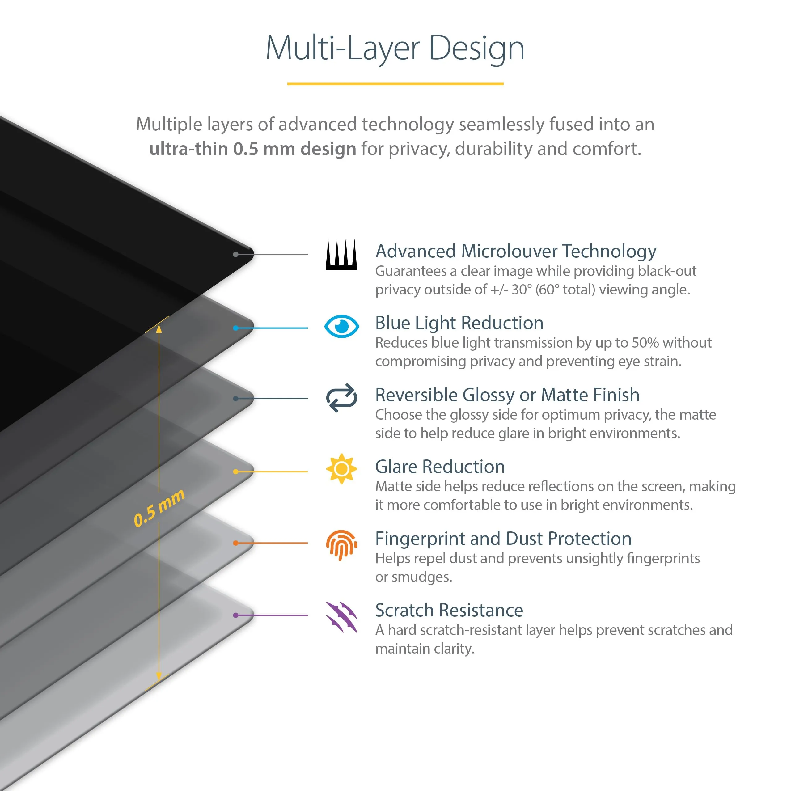 The filter seamlessly integrates with your device, ensuring no interference with webcams, sensors, or the ability to close the lid. Additionally, it helps reduce eye strain by blocking up to 51% of blue light, making it perfect for long hours of use.