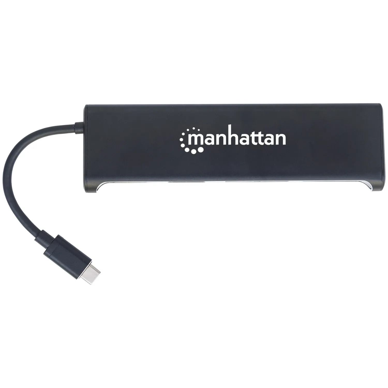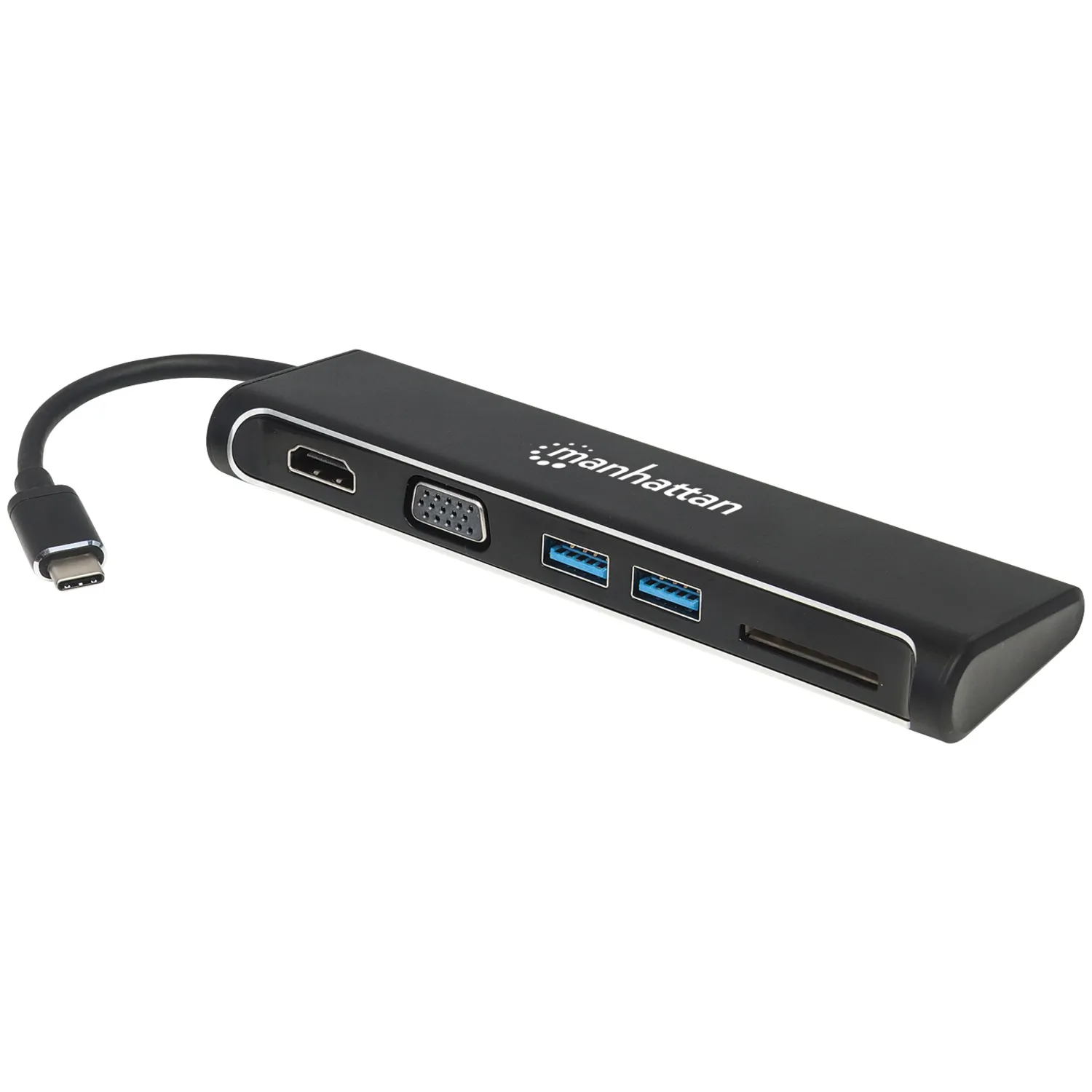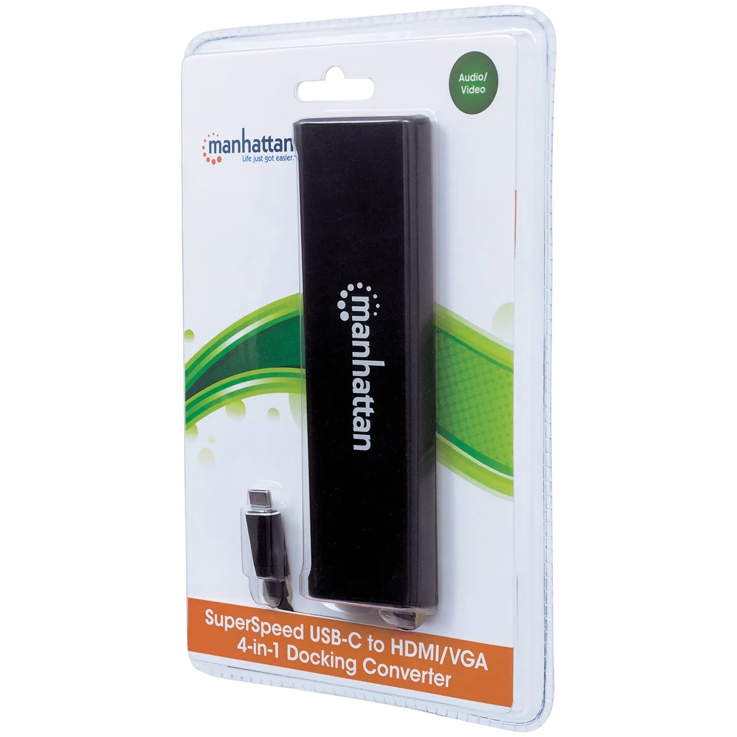 The Manhattan SuperSpeed USB-C to HDMI/VGA 4-in-1 Docking Converter establishes a fast, simple and convenient link between newer USB type-C equipped media sources and existing HDMI/VGA displays, in either mirror- or extended-display mode. Create a mini-workstation by adding any USB 3.0 peripheral such as a mouse, keyboard, hub, external memory device and more with the integrated USB 3.0 ports and SD Card slot.