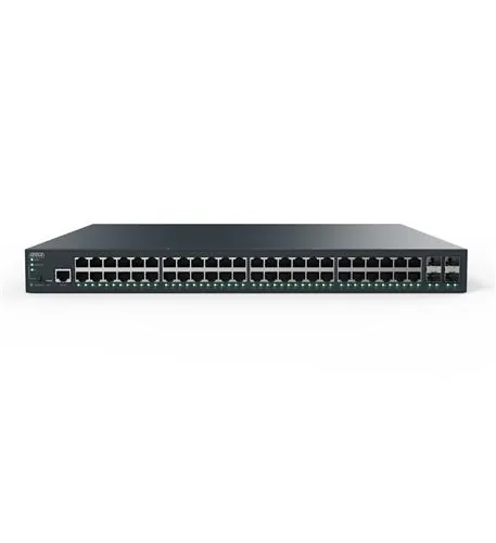 This fully managed switch features 4 SFP+ ports for 10 Gbps connectivity, facilitating high-speed uplinks. The device operates with a non-blocking Layer 2 and Layer 3 switching capacity of up to 176 Gbps, making it ideal for scalable network architectures.
