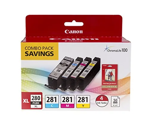 High Yield/Standard Yield; Contains 4 Ink Tanks; PGI-280 XL Pigment Black, 1 CLI-281 Cyan, 1 CLI-281 Magenta, 1CLI-281 Yellow and 50 Sheets of Glossy 4?x6? Photo Paper (PP-301); Beautiful, long lasting inks for photos and documents at a great value