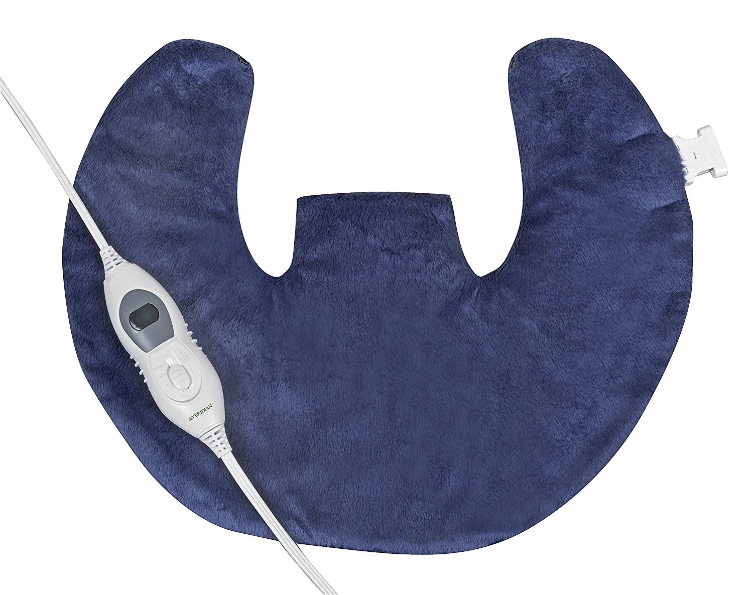 This TheraCare Deluxe Heating Pad Wrap for Shoulder and Neck is a generous size for neck and shoulder pain relief. The weighted trim and neck snap holds the wrap firmly in place. The 18" x 15" wrap is made of a soft, micro-plush fabric and is machine washable. 1) Quick and easy operation, 2) 3 temperature settings, 3) Automatic shut-off.