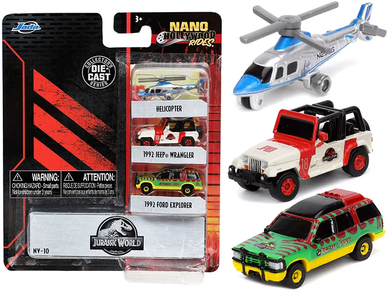 • Brand new diecast models of "Jurassic World" 3 piece Set "Nano Hollywood Rides" die cast models by Jada.
