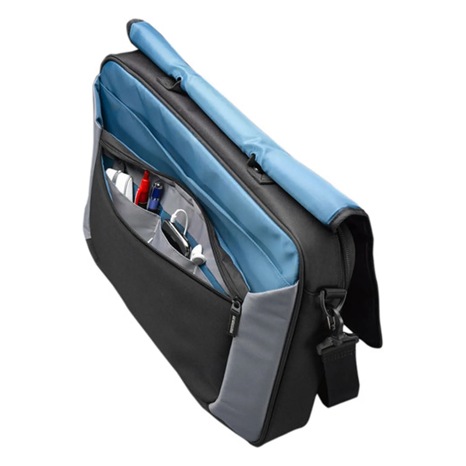 ? Fits notebooks with up to 17 screens;? Contemporary messenger styling with convenient top-load access;? Roomy storage underneath flap for files, power brick & other bulk storage needs;? Padded accessory pockets;? Integrated neoprene USB drive pocket;? Comfortable shoulder strap & padded handle;? Luggage strap;? Dim: 13.7H x 17.7W x 3.3D;