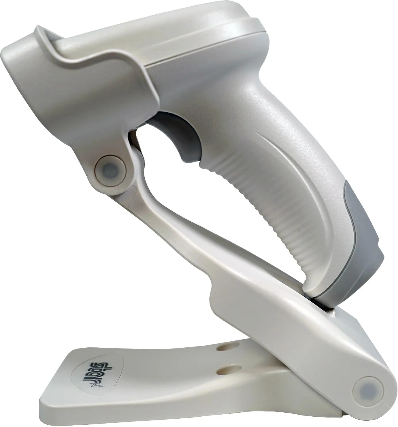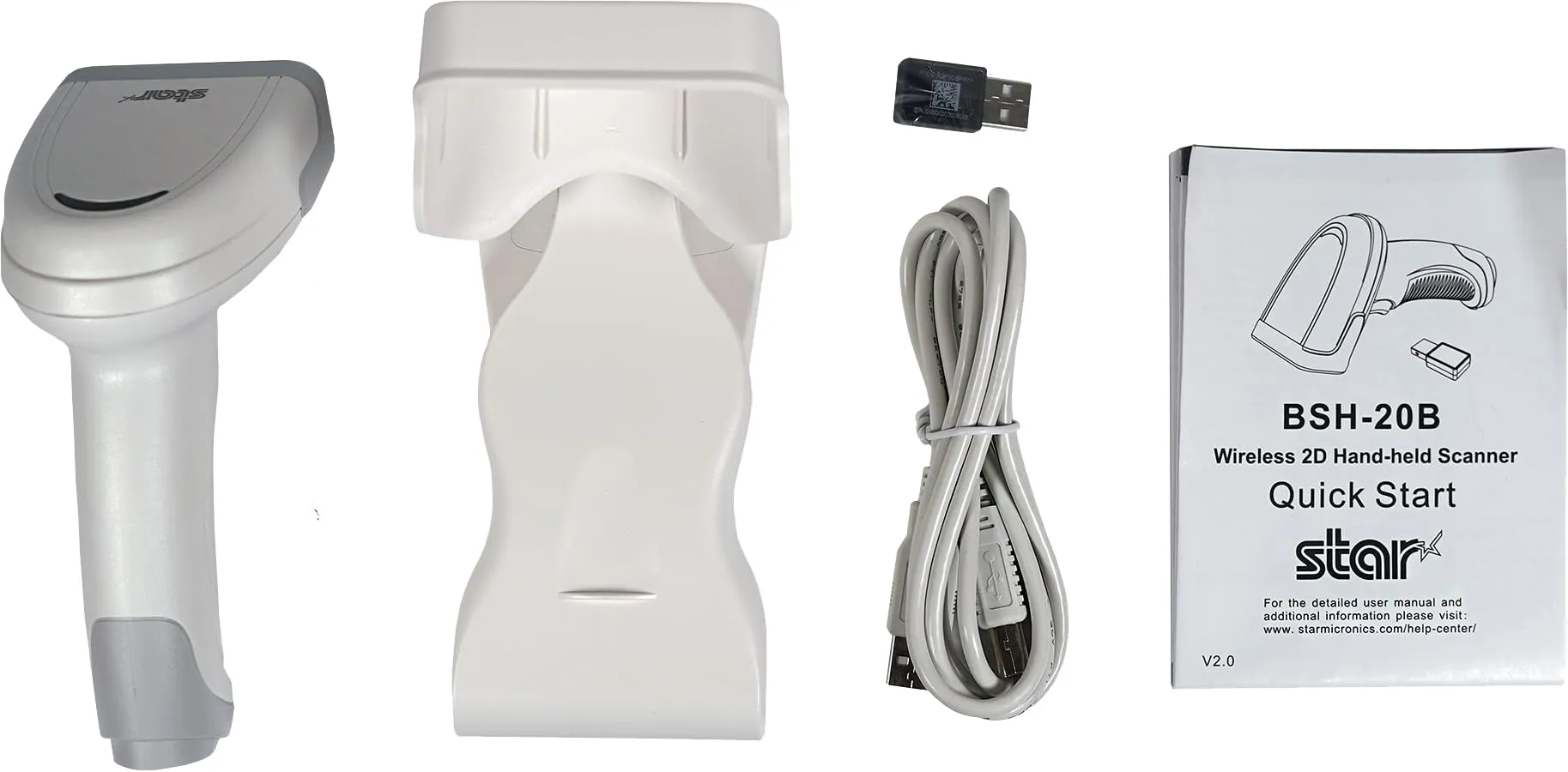 The Star Micronics BSH-20B is a versatile handheld scanner that supports both 1D and 2D barcode scanning. This battery-powered device features Bluetooth 5.0 and a USB wireless adapter, making it a flexible choice for various applications. Included with the scanner is a stand for easy storage and accessibility. Compatible with MC-Print and MPOP, the BSH-20B is ideal for retail, hospitality, and other industries requiring efficient and reliable scanning solutions.