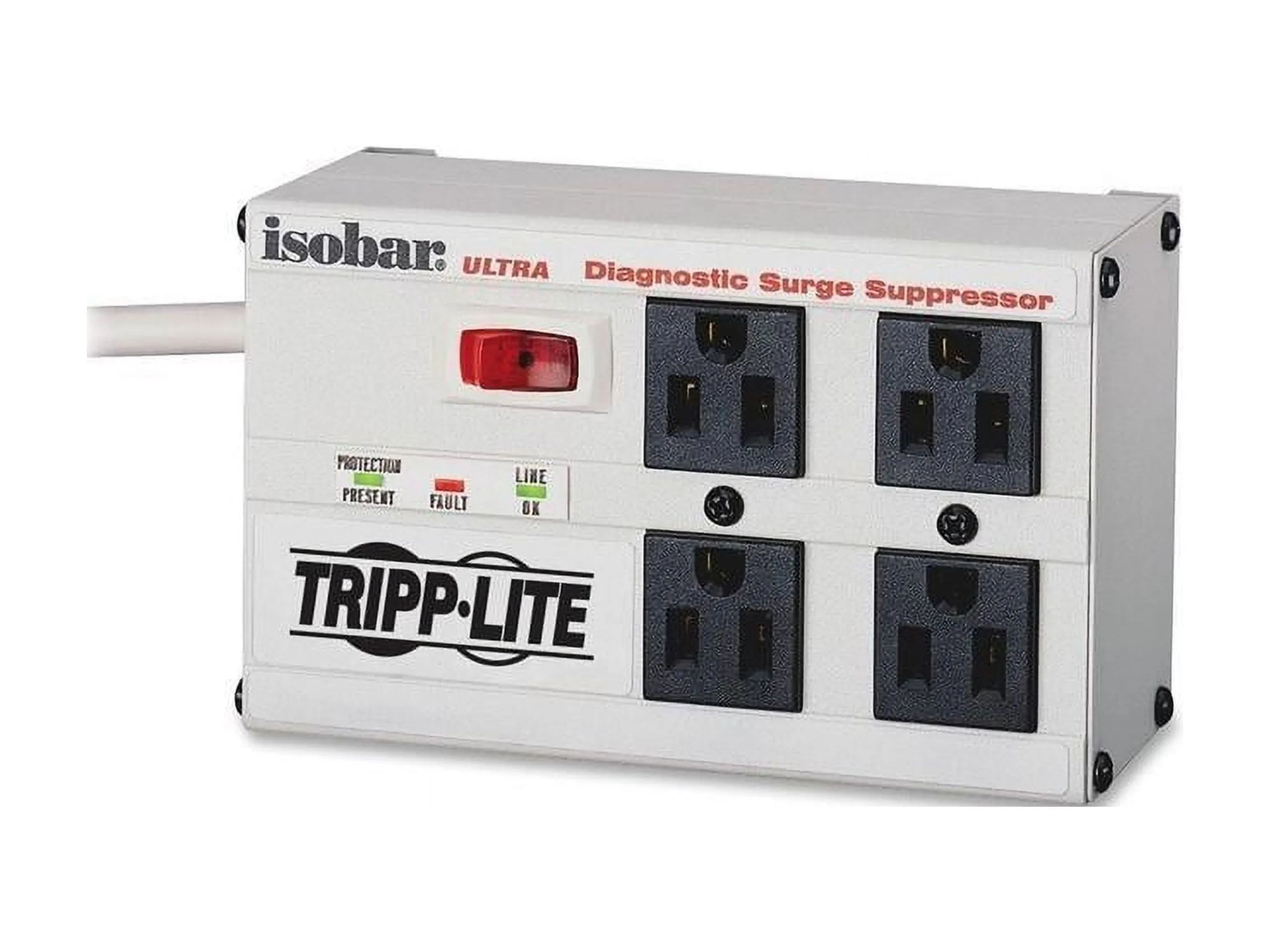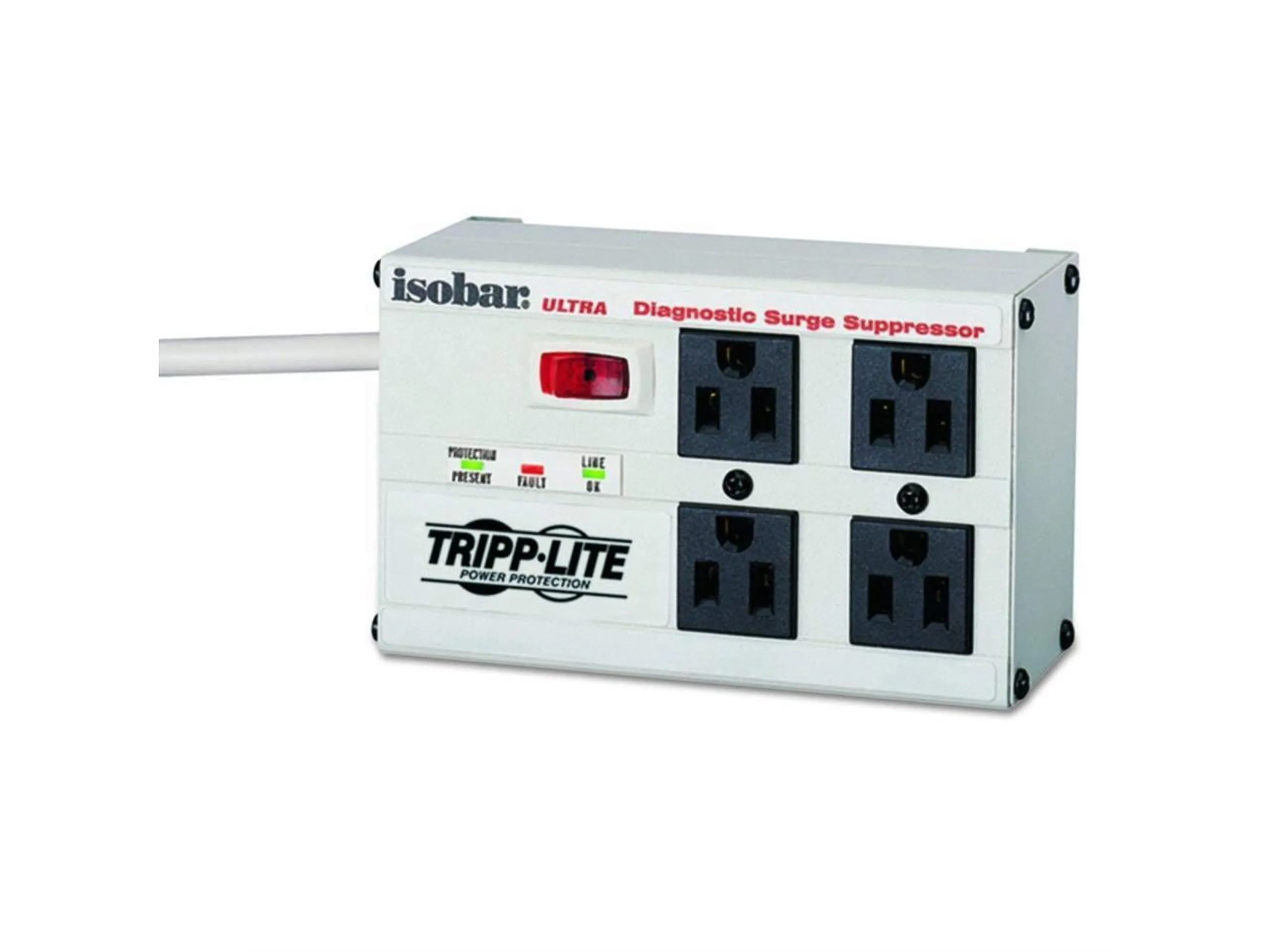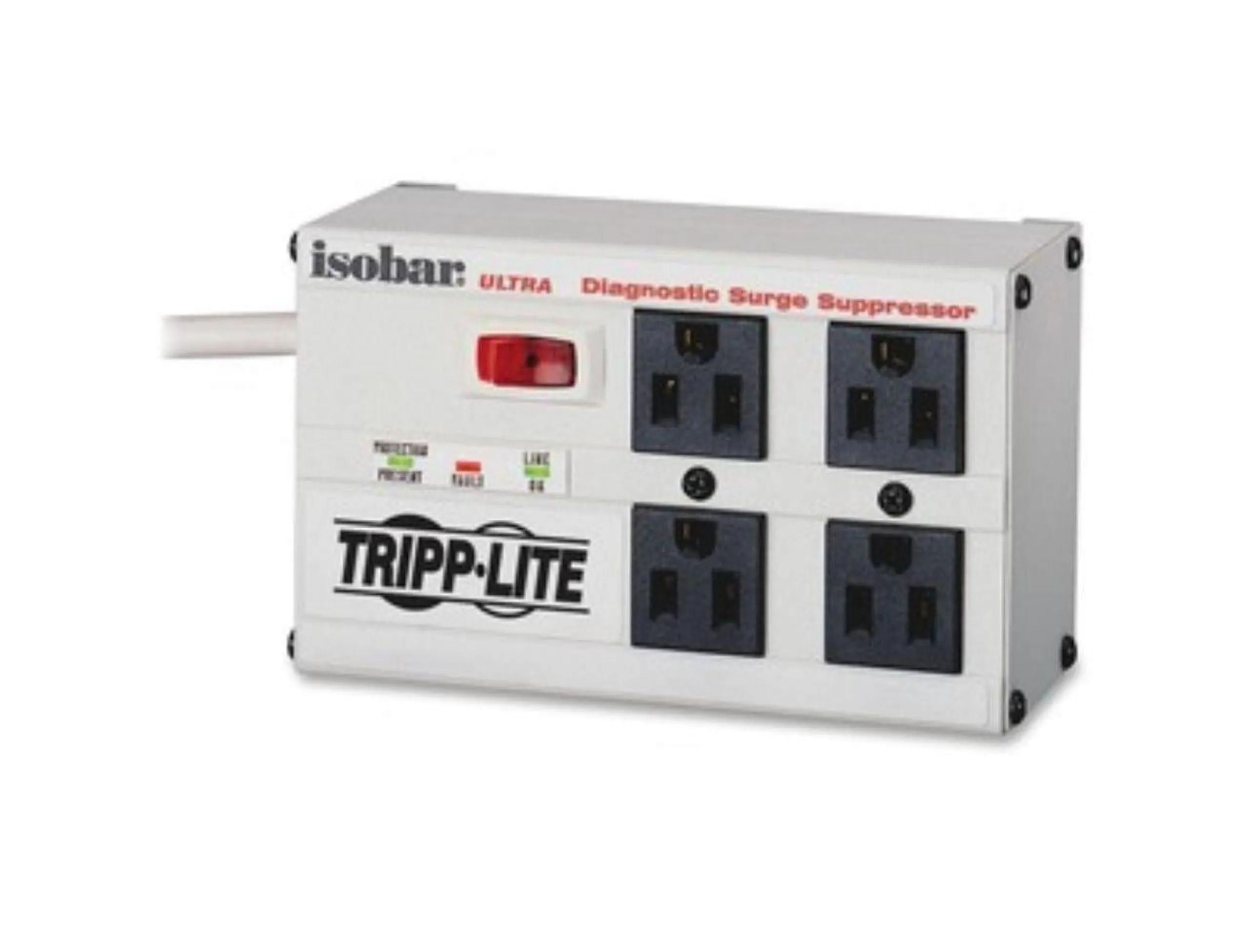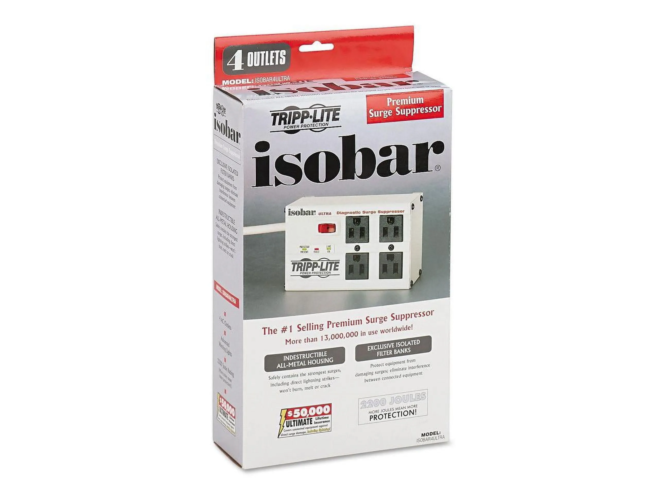 Premium protection for essential network workstations, telecom systems, point-of-sale equipment and audio/video systems, the ISOBAR4ULTRA Isobar(R) 4-Outlet Surge Protector features a network-grade surge protection rating of 3330 joules to defend your sensitive electronics against even the strongest surges and spikes. In fact, Tripp Lite will repair or replace any connected equipment damaged by surges up to $50,000 for life (valid in the U.S., Canada and Puerto Rico only).Because residential power outlets have three wires--hot line (H), neutral (N) and ground (G)--the ISOBAR4ULTRA protects all three, covering the two protection modes: full normal mode (H-N) and common mode (N-G/H-G).Your devices plug into four widely spaced NEMA 5-15R outlets, which are arranged in two exclusive isolated filter banks. These internal barriers filter out electromagnetic interference (EMI) and radio frequency interference (RFI) that can disrupt your electronics and inflict hardware damage or data loss.Included safety covers block accidental contact with unused outlets. An integrated 12A circuit breaker protects all outlets and shuts down connected equipment in case of overload. The lighted on/off switch provides one-touch control over connected equipment. Diagnostic LEDs confirm power, protection and line fault status. The six-foot (1.8-meter) AC power cord includes a space-saving right-angle NEMA 5-15P plug.
