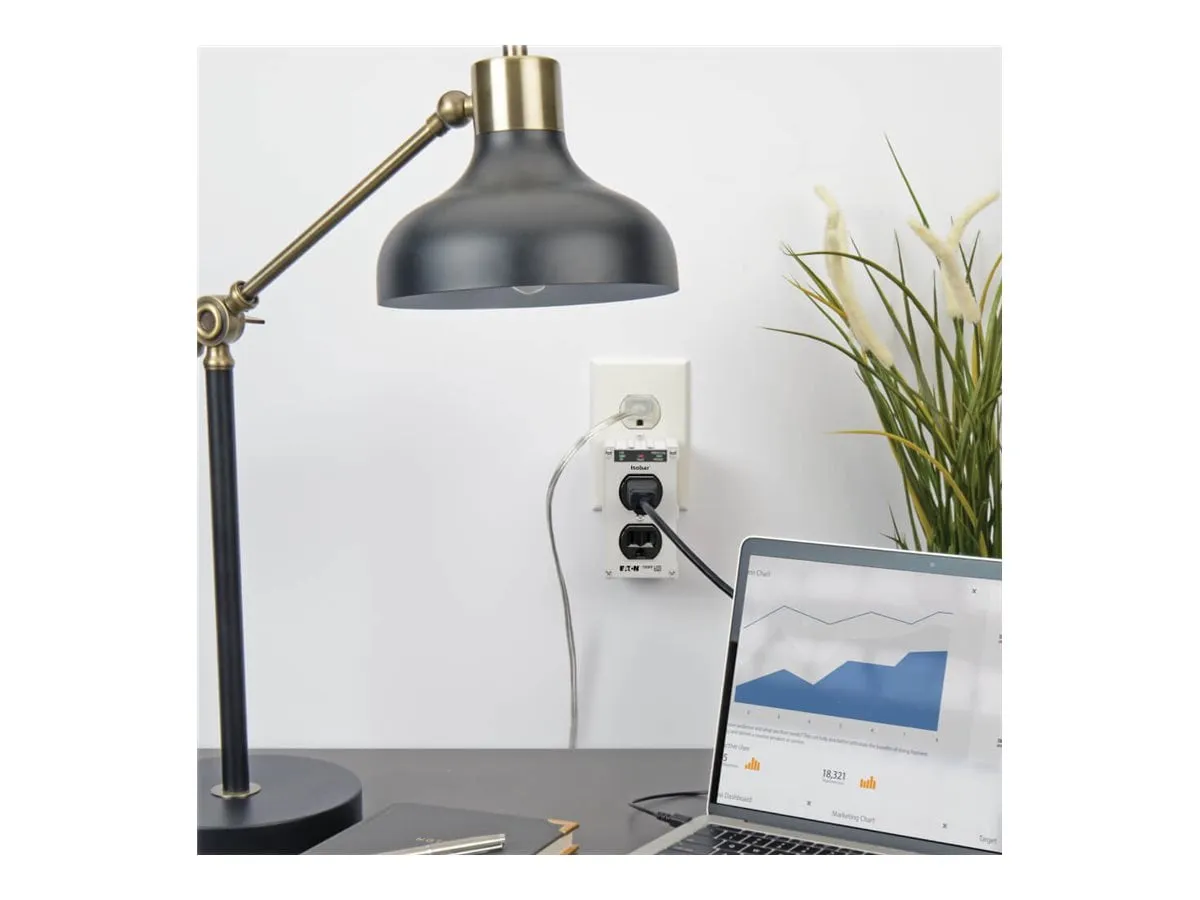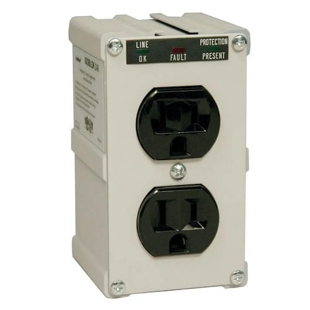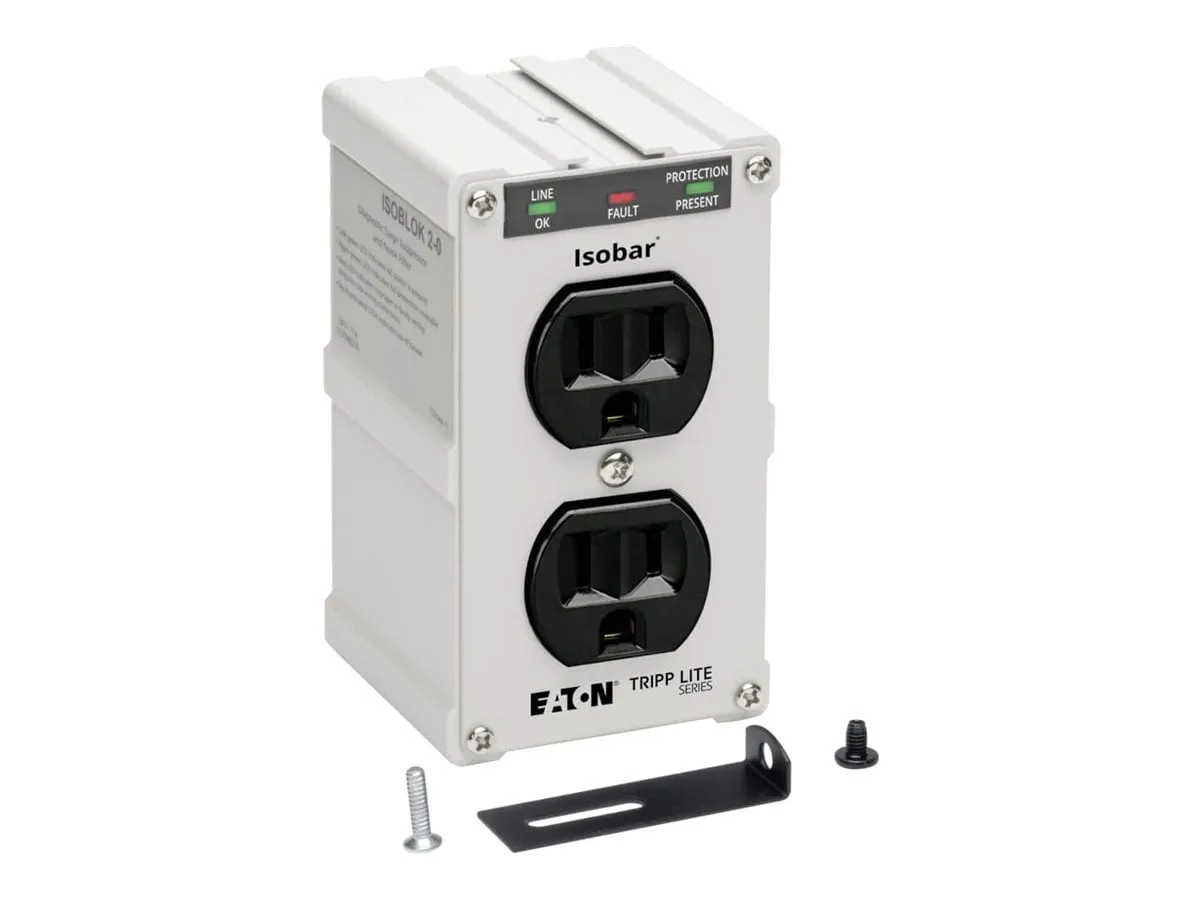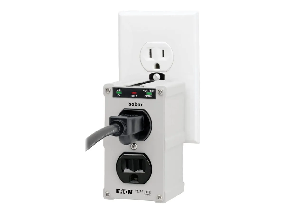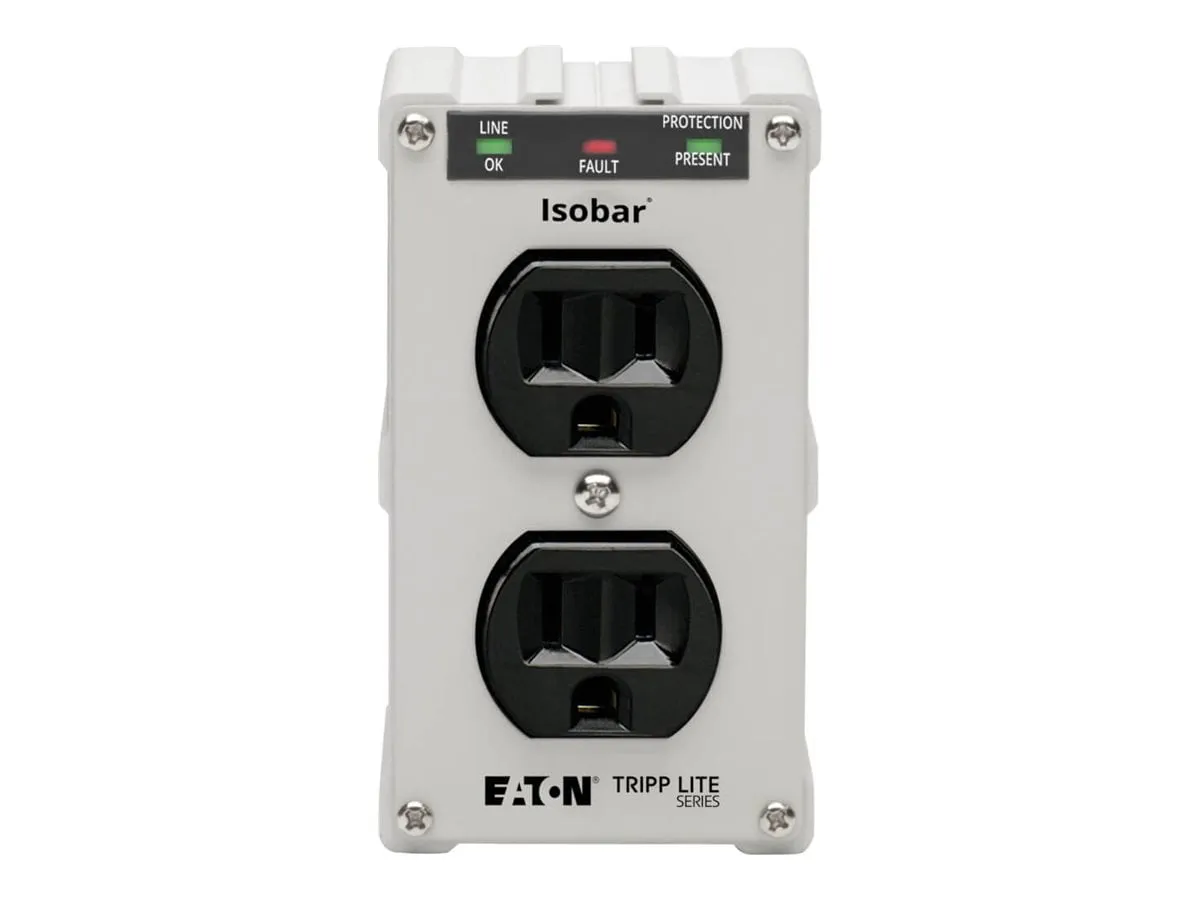 Isobar 2-Outlet Surge Protector. 1410-Joule Surge Protection for Your Home Theater Electronics and Computer Peripherals. Protects your components against surges and spikes. Full normal mode (H-N) and common mode (N-G/H-G) line surge suppression . 2 NEMA 5-15R surge-protected outlets Premium Safety Features. Diagnostic LEDs confirm power, protection and ground status at a glance . Conforms to current UL 1449 3rd Edition safety standards Fits Effortlessly Into Your Setup. Plugs directly into standard NEMA 5-15R outlet with no power cord .Optional hardware included for permanent mounting to outlet cover . Metal housing designed for long life Backed by Tripp Lites Ultimate Lifetime Insurance . $10,000 Ultimate Lifetime Insurance covers any connected components damaged by power surge (U.S., Canada and Puerto Rico only)
