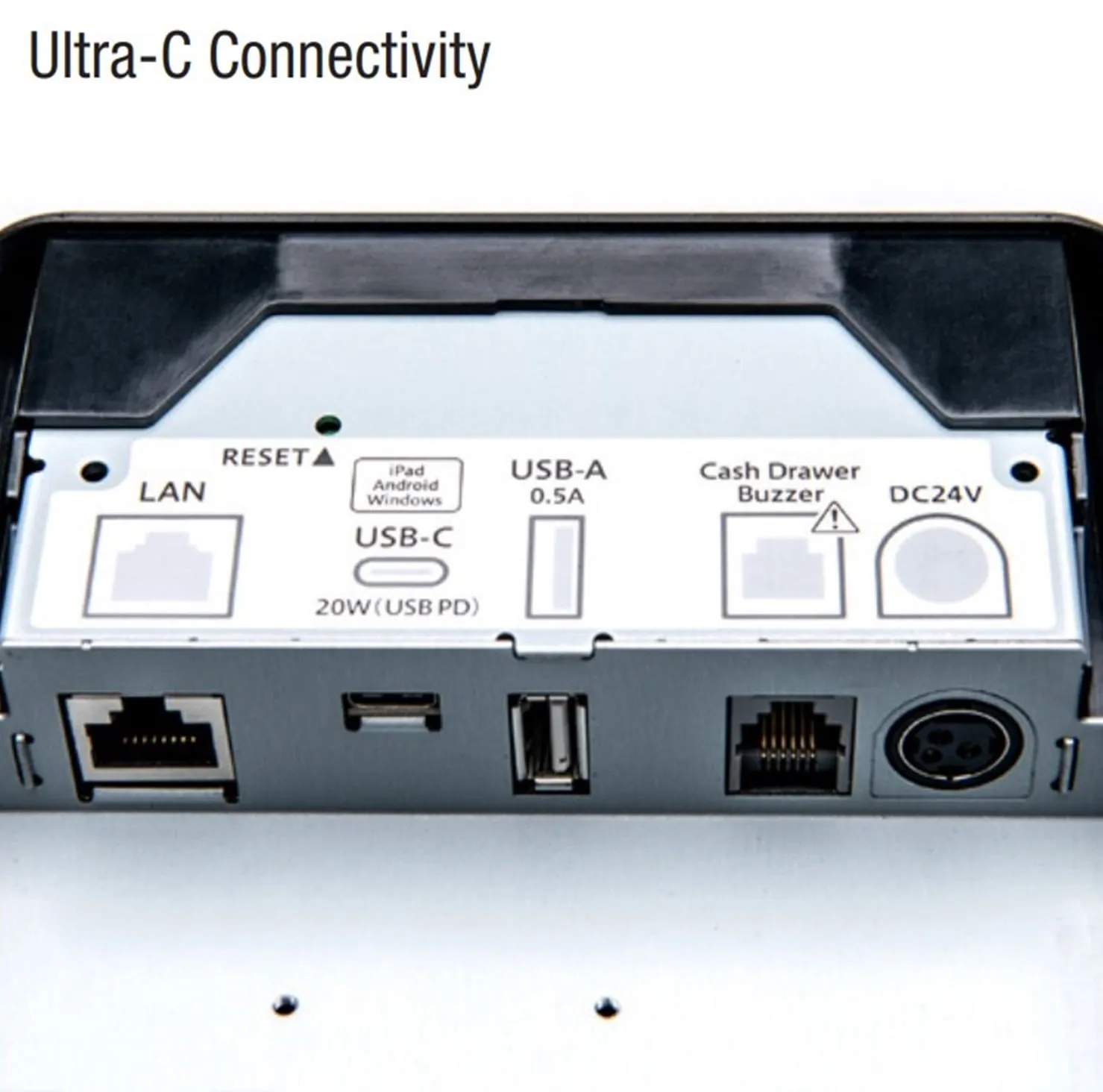 Key features include Ethernet (LAN), USB-C with power delivery, and a built-in peripheral hub. Ideal for cloud printing solutions, it supports SteadyLAN and CloudPRNT for seamless connectivity.