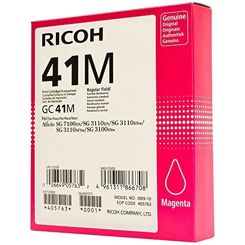 Standard yield magenta for use with ricoh sg3100snw, sg3110dn, sg3110dnw, sg3110sfnw, sg7100dn. This is a OEM JET RICOH brand Cartridge (SD MAGENTA ) that works with the following printers / machines (SG3100SNW, SG3110DN, SG3110DNW, SG3110SFNW, SG7100DN). Product Features: Compatible with: Ricoh SG 3100SNw, SG 3110DN, SG 3110DNw, SG 3110SFNw, SG 3120B SFNw, SG 7100DN Duty Cycle: Up to 2200 pages ISO/IEC 24711 Printing Color: Magenta Printing Technology: -jet Product Description: Ricoh - magenta - original - cartridge Product Type: cartridge Benefits of this product: Whether you're looking for guaranteed print quality or high performance, use Ricoh printer consumables to deliver superior results with peace of mind. STANDARD YIELD MAGENTA. SG3100SNW, SG3110DN, SG3110DNW, SG3110SFNW, SG7100DN. OEM RICOH Brand.