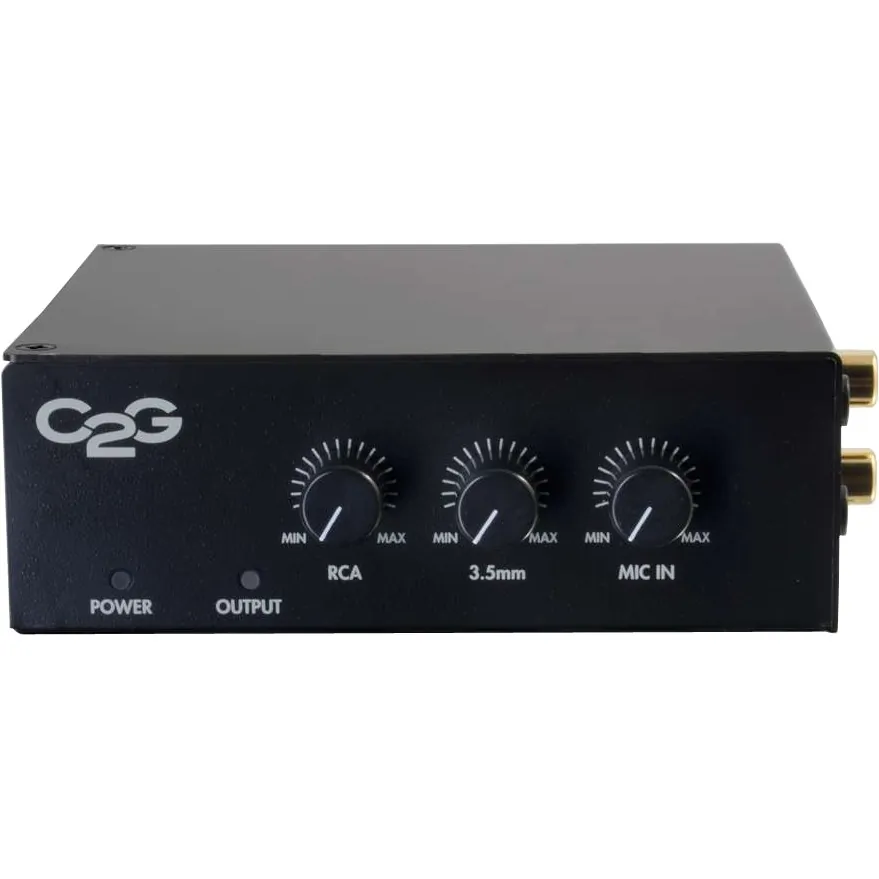 C2G/Cables To Go 40881 audio amplifier 50W 70V is the ideal solution for supporting a distributed audio system in a classroom, conference room or other environment that requires installation in a plenum space. This amplifier supplies 50 watts of power, 25 watts per channel, and is built to an industry standard 25/70 volt design. This amplifier supports many advanced Features which make it a perfect fit for most applications. This amplifier accepts a 3.5mm and RCA stereo audio input as well as a 3.5mm microphone input. The mixing function ensures that audio from all three inputs are mixed and sent to the speaker outputs. This amplifier is designed to accept either RS232 control or control signals from an industry standard volume control. The PA sensor will automatically mute the audio inputs of the amplifier allowing the public address to be heard. The accessory power output provides 12 Volts DC and 500 Amps. This makes the amplifier the perfect match for a controller such as the TruLink a/V controller.
