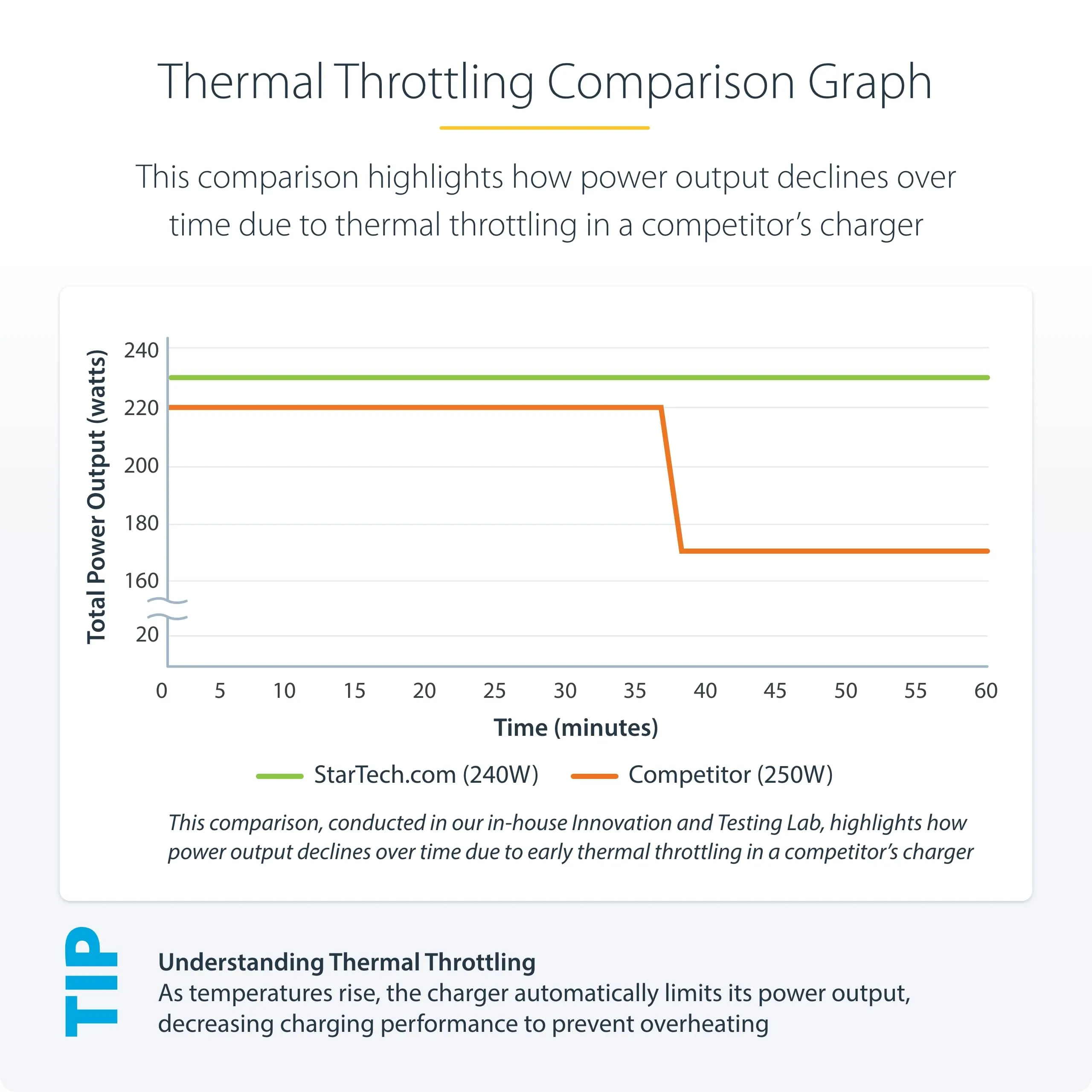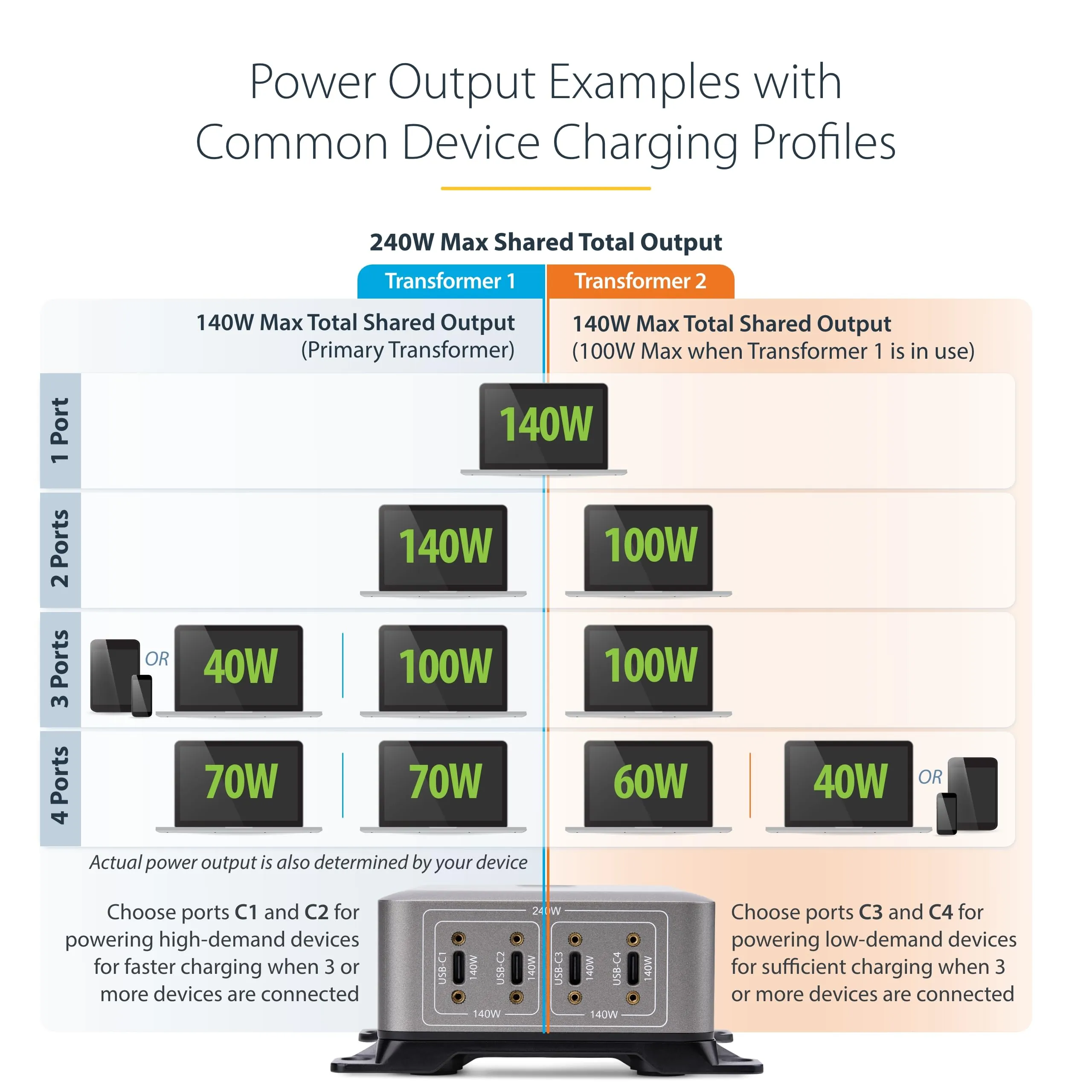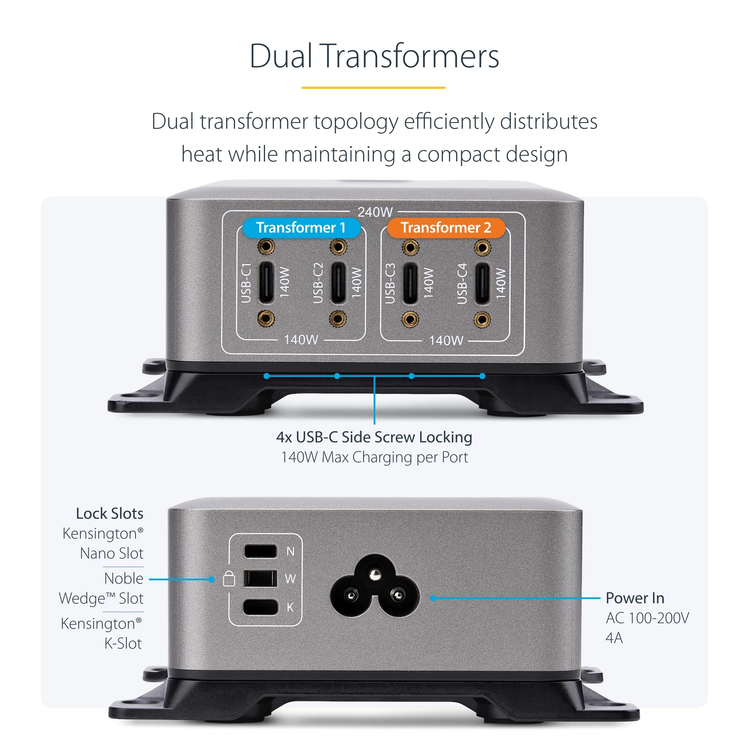 USB-C desk charger with 4x USBC (single port 140W EPR Power Delivery 3.1) - Charge up to four laptops simultaneously with a total power of 240W - Runs cool under extended full-load use - Charges 16" MacBook M3/M4 Pro/Max from 0-50% in 30 mins - Meets DOE Level VI standards - USB-IF compliant/UL Listed/FCC/CE/IEC-62368-1 compliant with built-in over-voltage over-current/temperature protection - Consolidate chargers/free up desk space in meeting rooms