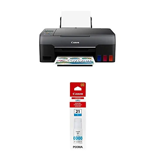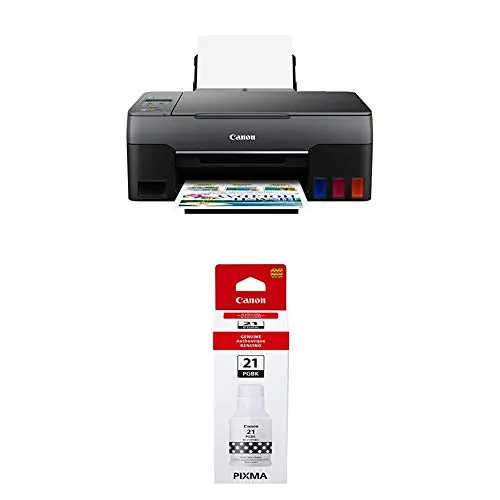 Marketing Information:PIXMA MegaTank Inkjet Printer is fitted with refillable ink tanks and enough ink to do the work of 30 conventional ink cartridge sets. Print up to 6,000 pages in black or 7,700 pages in color to produce crisp blacks and rich colors with a high page yield. Estimated print speed is approximately 9.1 ipm in black and 5 ipm in color with a print resolution up to 4800 x 1200 dpi. Use GI-21 Pigment-Based Black Ink Bottles and GI-21 Dye-Based Color Ink Bottles for vivid color. Printer is compatible with a variety of paper sizes and types including glossy, semi-gloss and matte photo paper for borderless photo printing. Rear input tray holds up to 100 sheets of plain paper. Versatile printer features document, photo, business card, greeting card and label printing. Connect your Windows or Mac device using high-speed USB for quick, efficient printing. Use the simple button panel for an effortless experience. Energy-efficient printer is Energy Star certified.