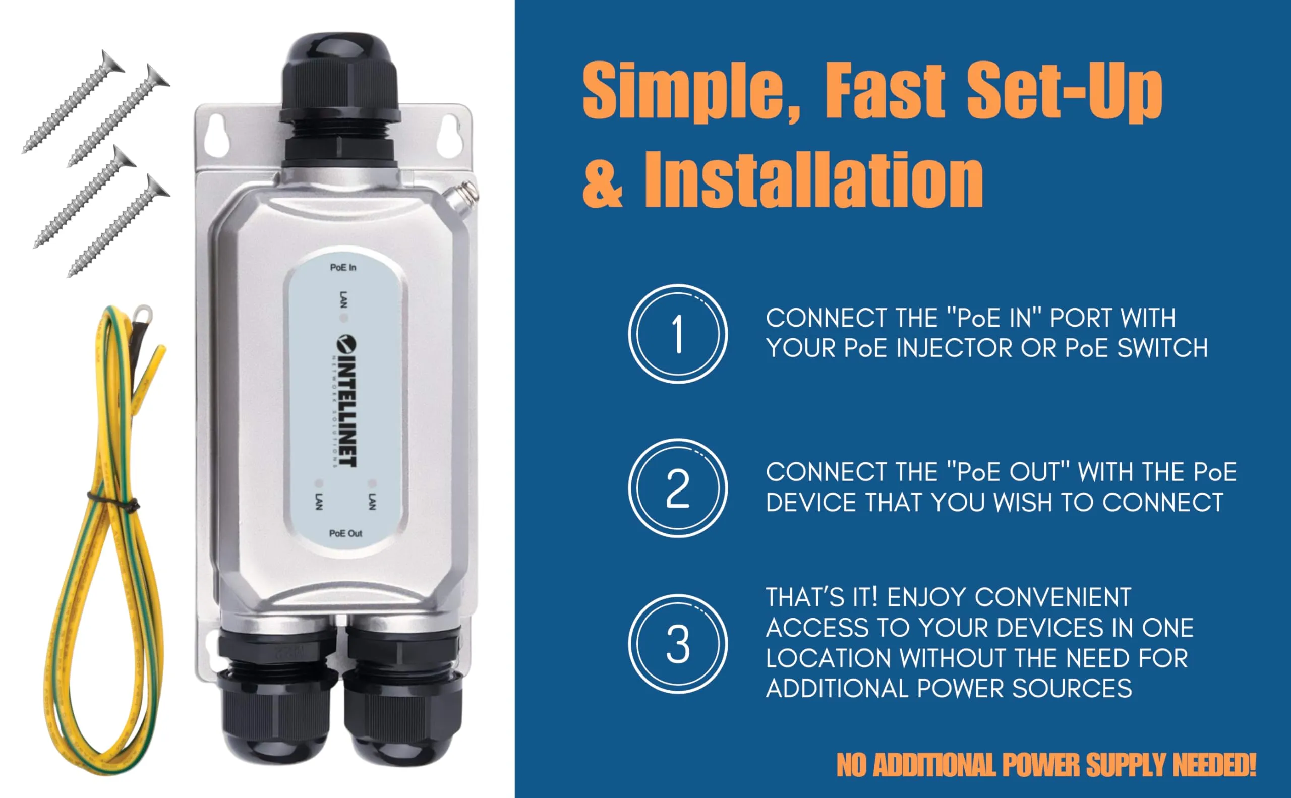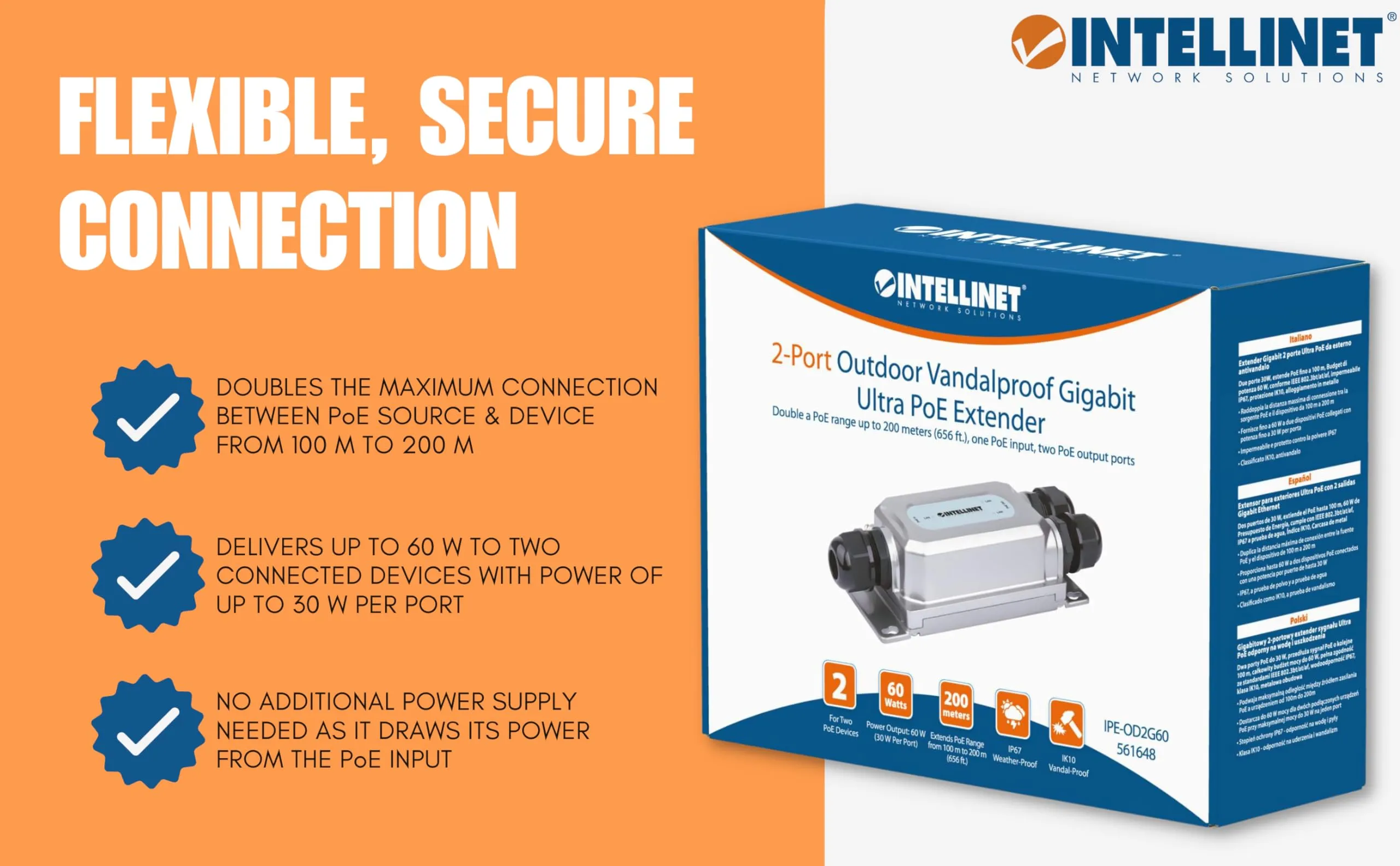 The Intellinet 2-Port Outdoor Vandalproof Gigabit POE Extender is designed to enhance connectivity in outdoor environments while ensuring optimal protection against vandalism. With its robust construction and advanced technology, this extender allows for seamless data transmission over long distances while supporting Power over Ethernet (POE) capabilities.