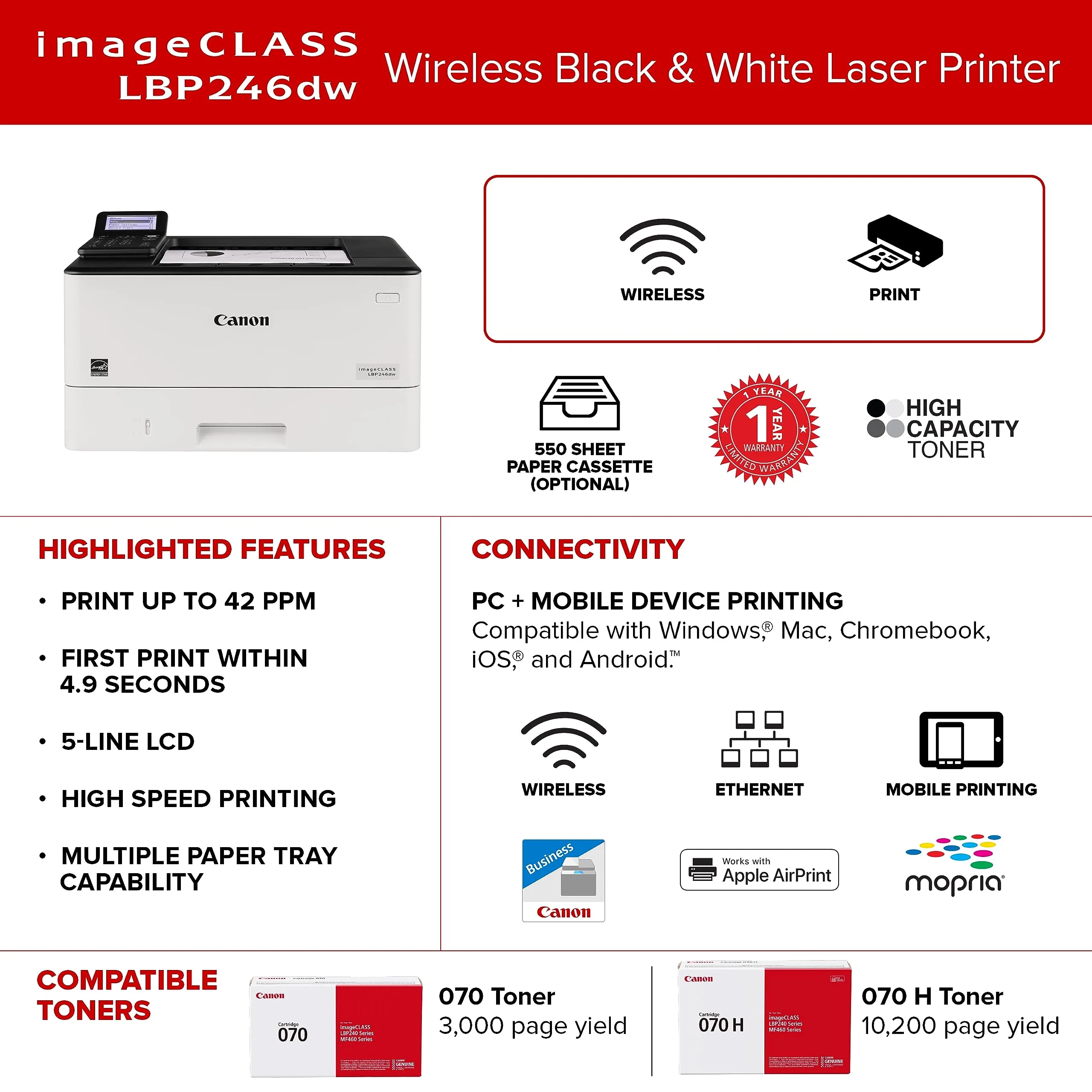 The Canon imageCLASS LBP246dw is a high-performance duplex laser printer designed for small to medium-sized offices. With fast printing speeds of up to 42 pages per minute and a resolution of 1200 x 1200 dpi, this printer delivers sharp and professional-quality prints.