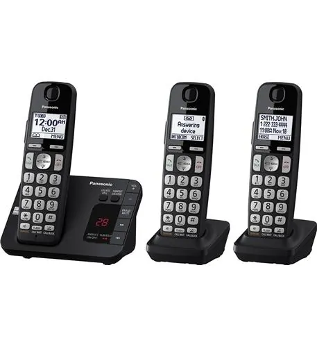 The Panasonic KX-TGE433B is an expandable cordless phone system that includes a base station with a digital answering system and three cordless handsets. Designed with DECT 6.0 digital technology, it ensures secure and interference-free calls with exceptional sound clarity. The digital answering system offers up to 17 minutes of recorded message time and allows you to retrieve messages from any handset in your home.