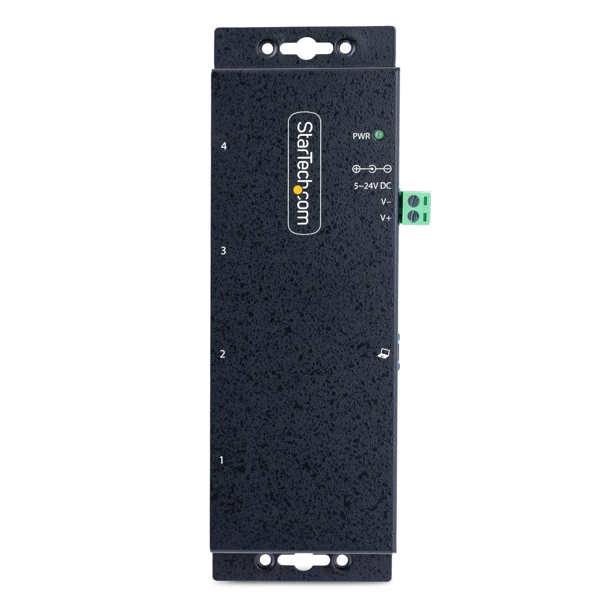 Industrial USB hub adds 4 USB-A Downstream Facing Ports (DFP) - 6ft A-B host cable - 5Gbps shared - Rugged metal design - 6ft A-B Host Cable - USB Event Monitoring - ESD level 4 USB hub features 15kV air and 8kV contact electrostatic protection - Mount hub to a wall/desk/DIN rail - USB port expander is powered by the DC barrel connection or terminal block using a 5 to 24V DC source (not incl) - When connected to power source the hub supports BC 1.2 charging on each port - OCP prevents overdraw