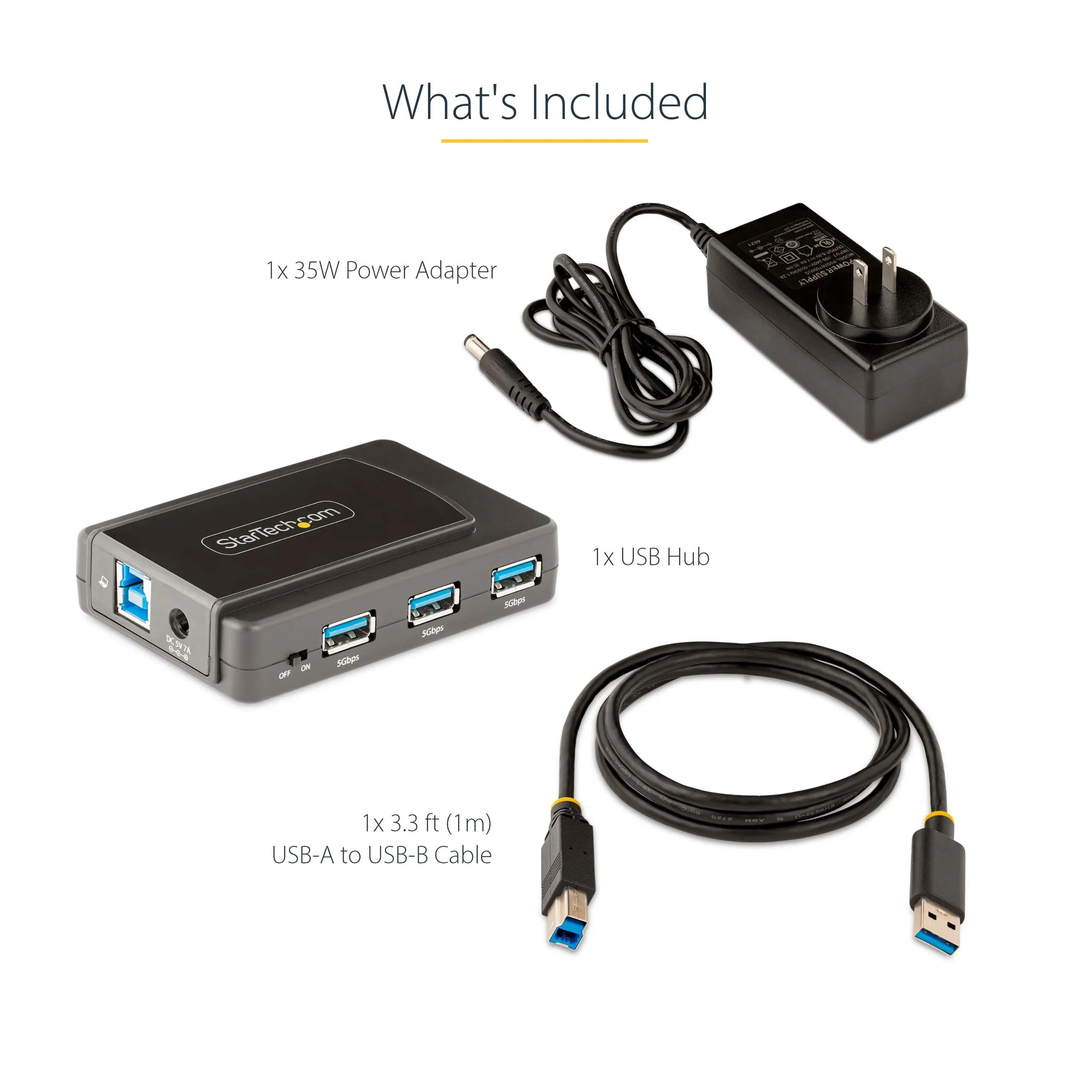 Included in the package is a 3ft detachable USB-B to A host cable and a power adapter, ensuring you have everything you need to get started. Compatible with Windows, macOS, Linux, and ChromeOS, this hub is your perfect companion for connectivity.
