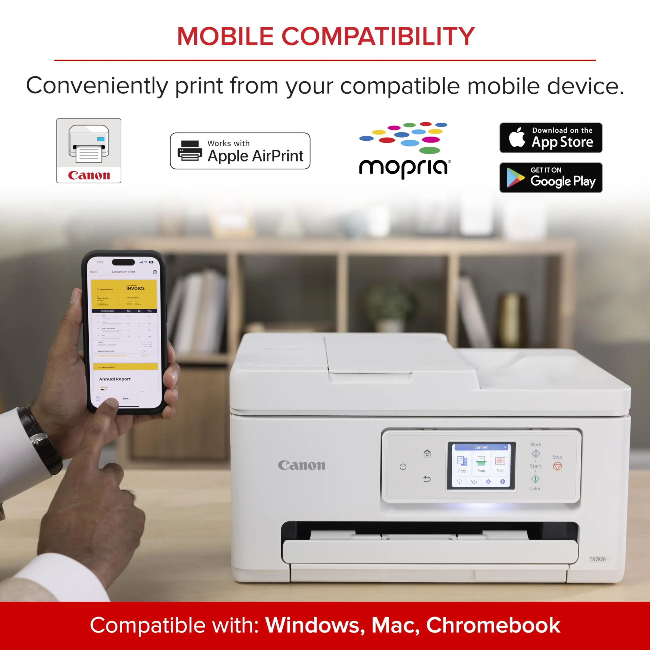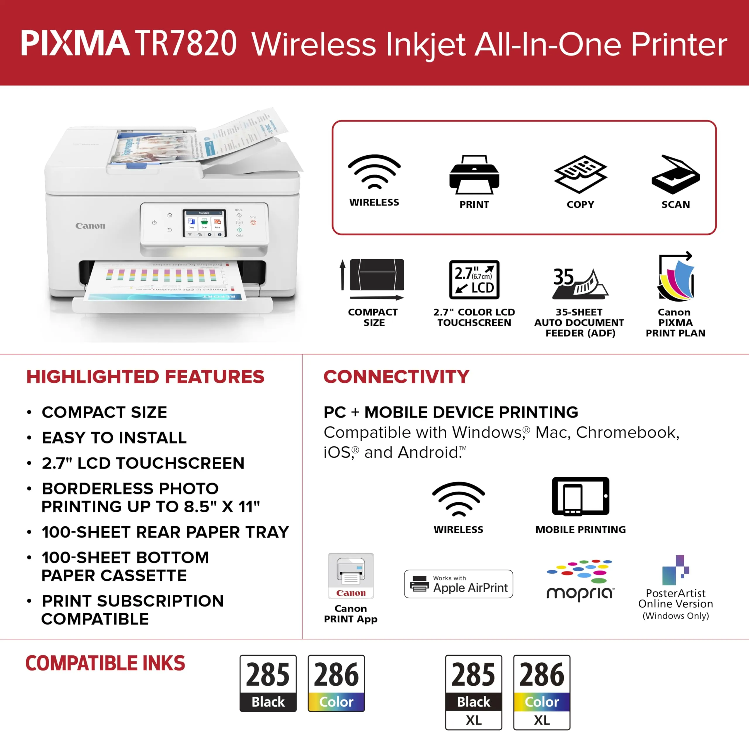 The Canon PIXMA TR7820 is a versatile all-in-one printer designed for home and office use. It offers wireless connectivity, enabling you to print from your smartphone or tablet with ease. With its compact design, it fits comfortably in any workspace.