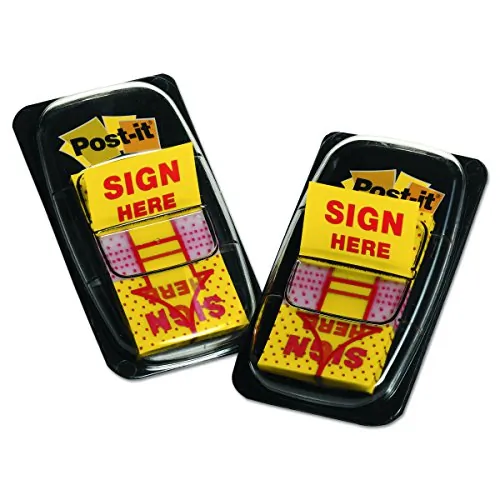 Post-it Message Flags feature "Sign Here" messaging. The Yellow 1" wide Post-it Flags help you draw attention to and request specific actions to help prevent unnecessary questions. Eye-catching, these colorful flags are easy to spot and have a removable adhesive allowing them to stick securely, be repositioned and remove cleanly. The handy detachable cartridges can be used as a stand-alone dispenser or placed in a desktop dispenser/organizer with a built-in Post-it Flags dispenser.