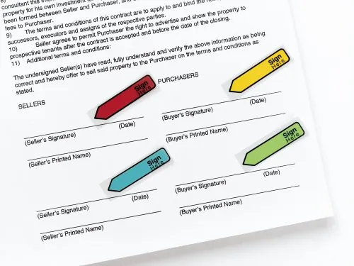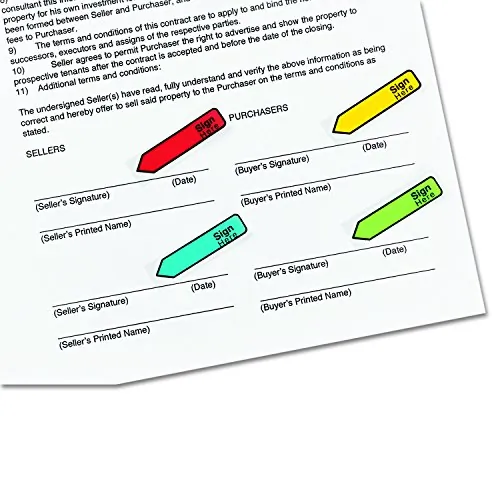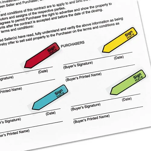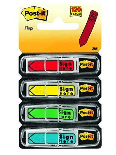 Post-it Printed Message Flags make it simple to request action. Ideal for marking documents without writing on them. Each flag sticks securely, repositions easily and removes cleanly. Bold arrow points precisely where you need a document signed, and the preprinted "Sign Here" message designates the action needed. Small flags dispense one at a time. Includes 30 flags in each color: yellow, blue, red and green.