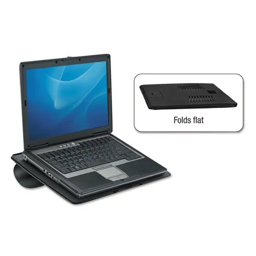 FOR LEGS. COOLING VENTS HELP PREVENT LAPTOP FROM OVERHEATING. FOLDS FLAT. HOLDS