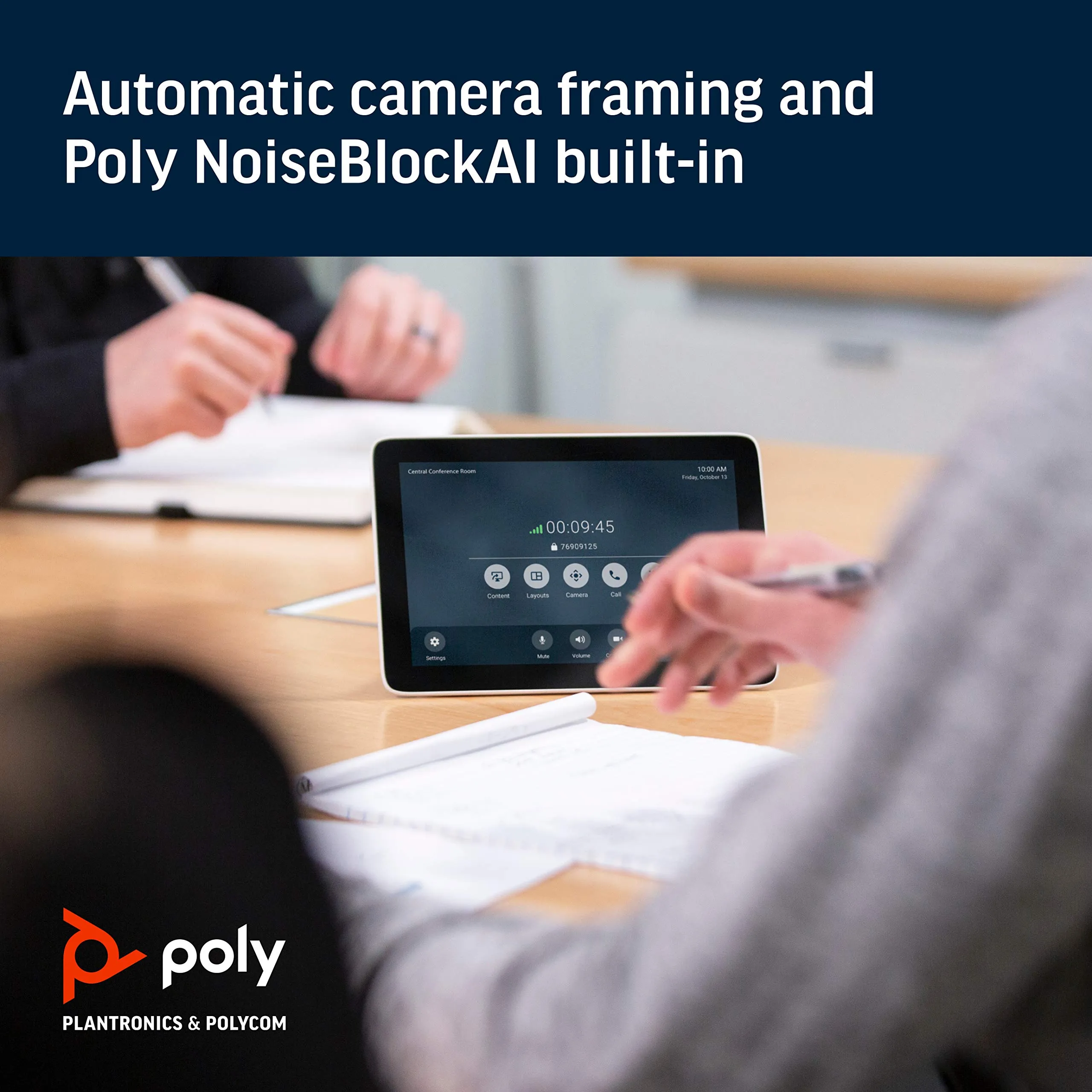 The Poly Studio X30 is an all-in-one video bar designed for medium-sized rooms, equipped with advanced AI technology for excellent audio and video quality. It comes bundled with the TC8 touch controller for seamless meeting management.