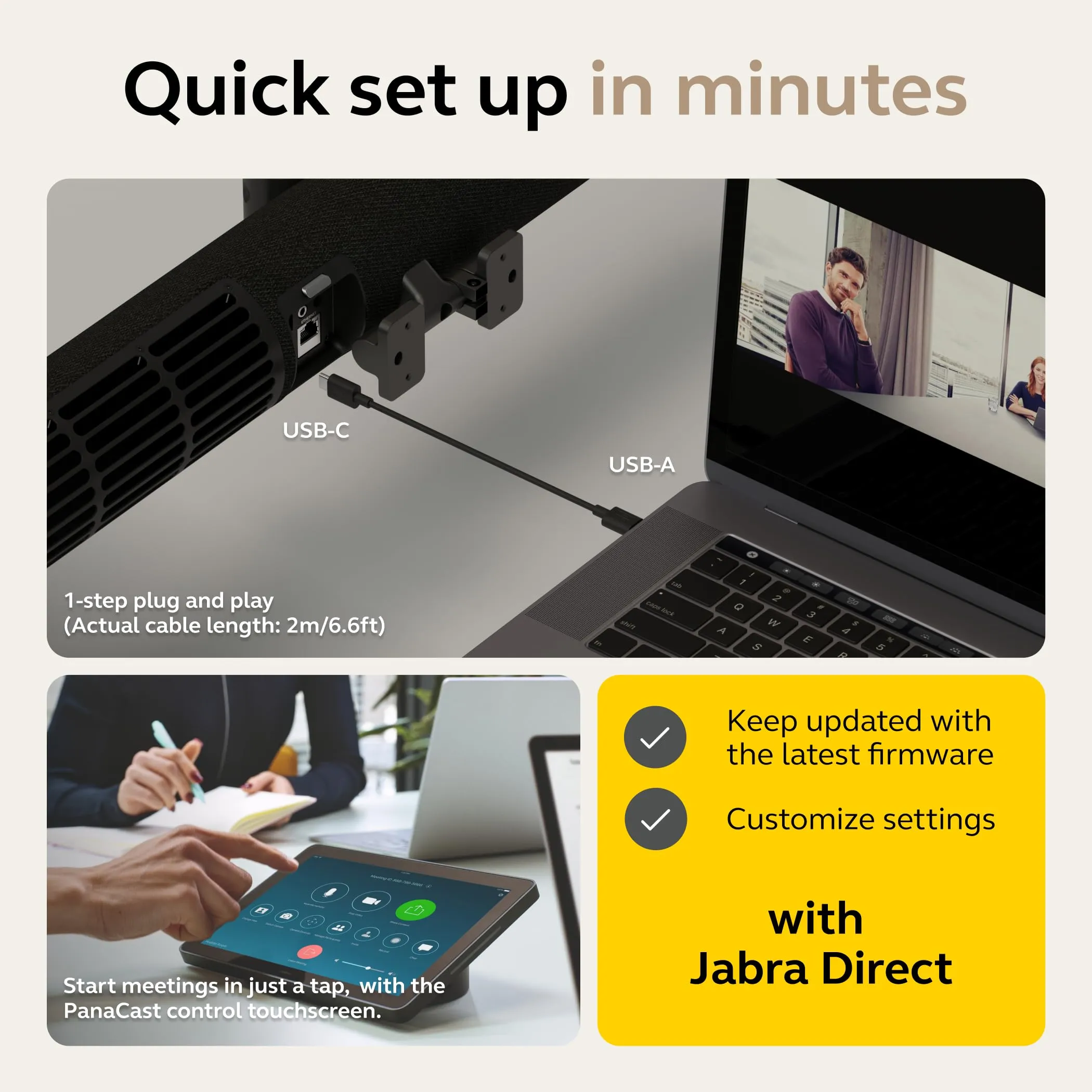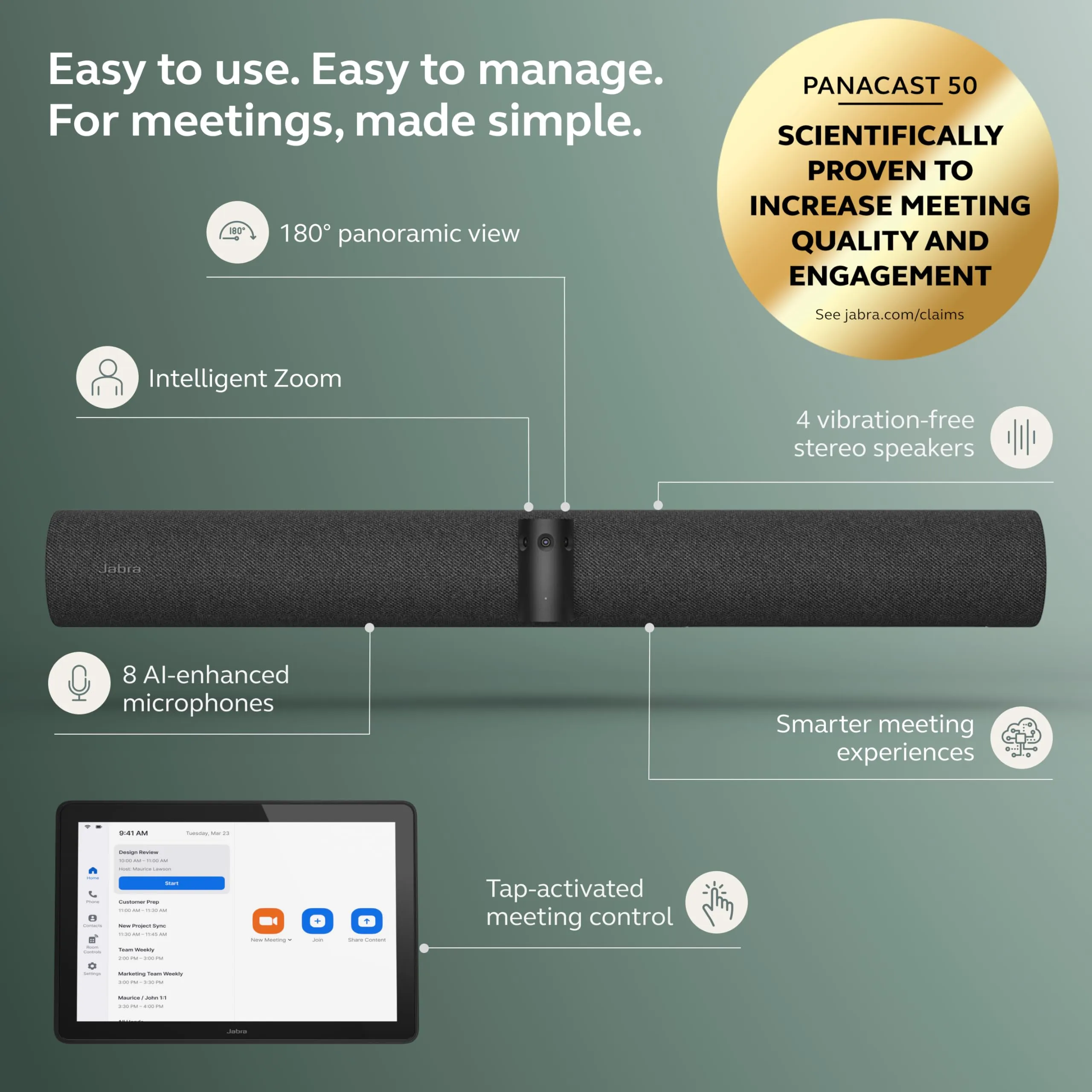 The Jabra PanaCast 50 Video Bar System delivers an exceptional video conferencing experience with its innovative 180-degree field of view, ensuring everyone is included in the meeting. Equipped with advanced audio and video technology, it facilitates clear communications and a seamless collaboration environment.