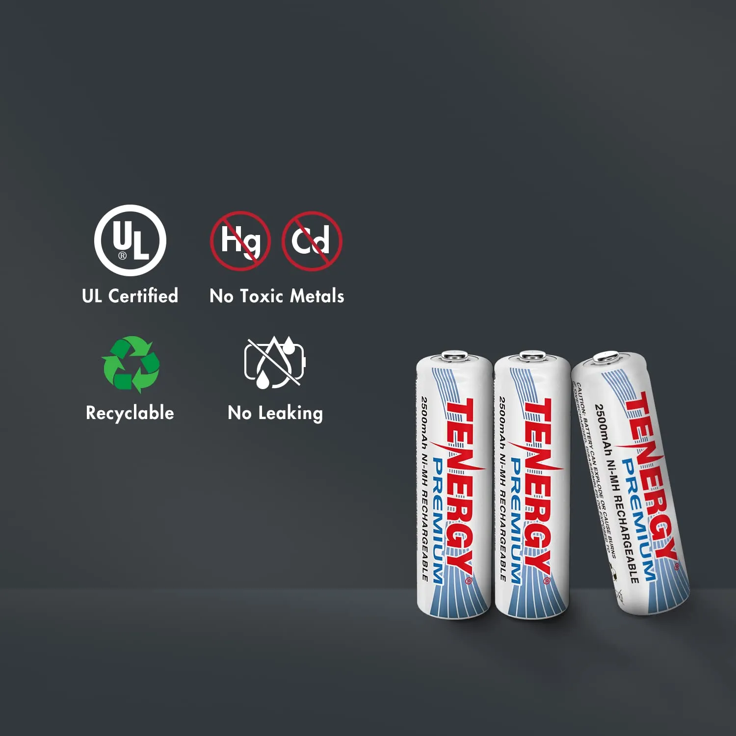 Experience optimal performance with Tenergy's Premium Rechargeable AA Batteries. Designed for high-capacity sustainability, these 2500mAh NiMH cells are perfect for powering your everyday devices, from remote controls to digital cameras. Enjoy the convenience of using rechargeable batteries while being environmentally friendly.