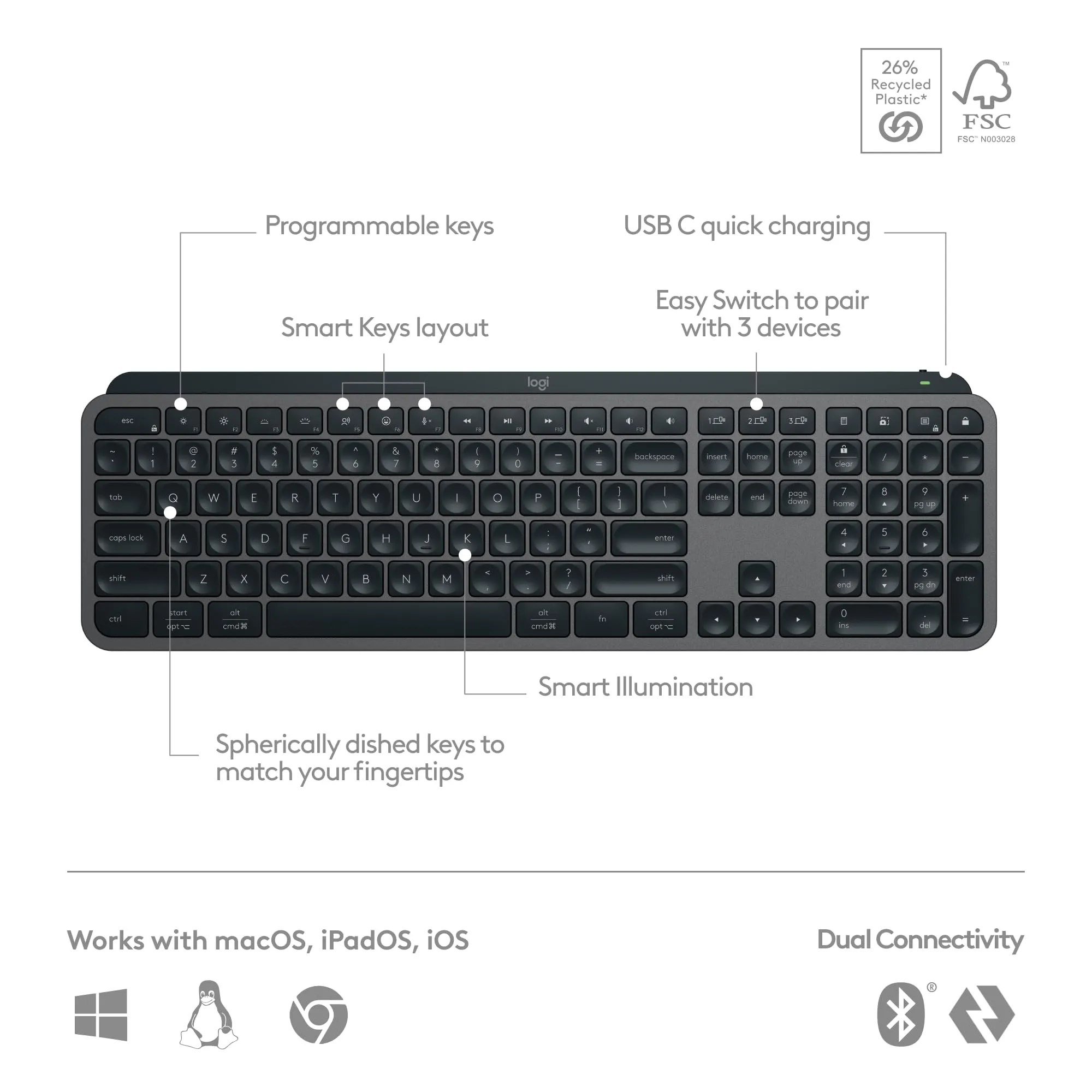 The Logitech MX Keys S is a premium wireless keyboard designed for efficiency and comfort. Its low-profile design features smart illumination, customizable keys, and a versatile layout that enhances productivity. The solid construction and stable key structure provide a satisfying typing experience, perfect for both work and entertainment.