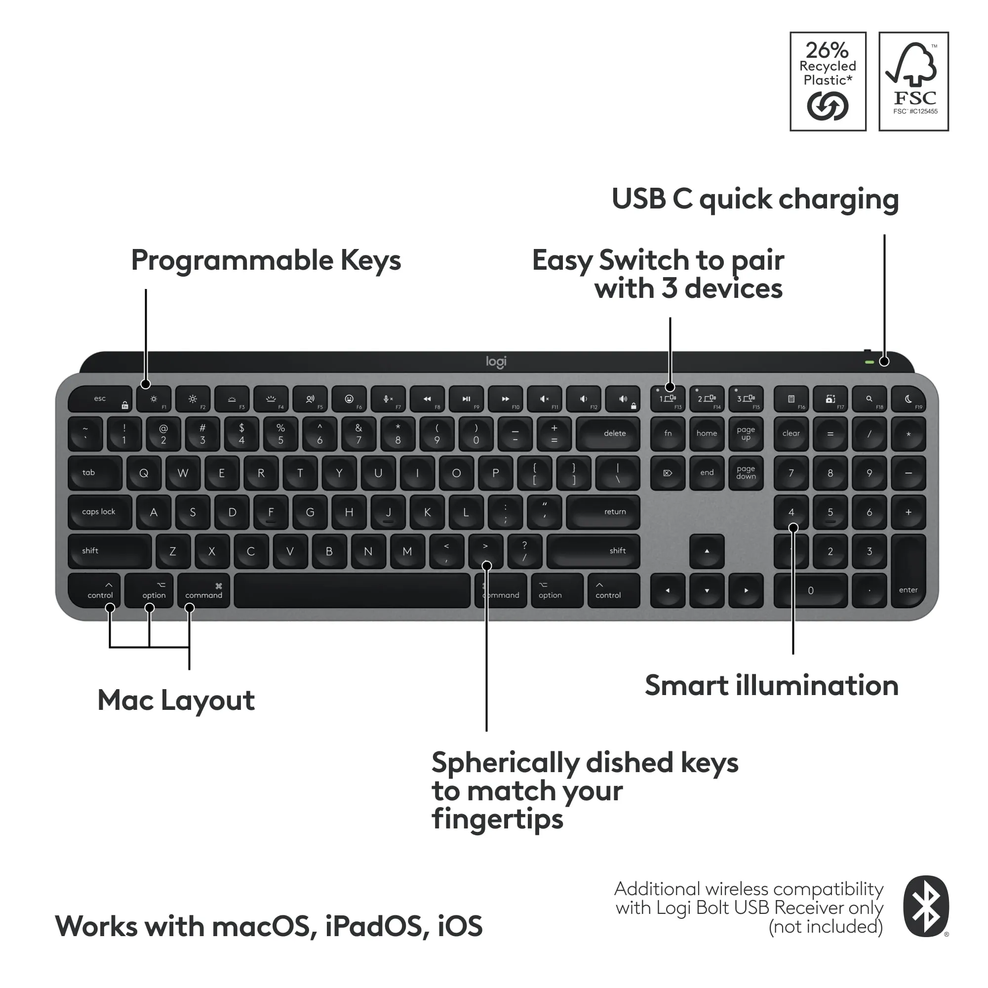 The Logitech MX Keys S for Mac is a wireless keyboard designed specifically for Apple devices. With its sleek space grey finish, it complements your Mac setup beautifully while providing a comfortable and responsive typing experience.