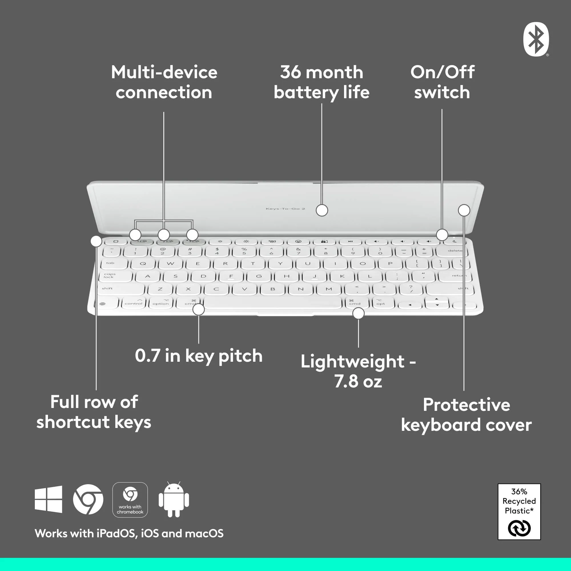 The KEYS-TO-GO Ultra-Portable Keyboard is designed for seamless typing on-the-go. With its slim profile and lightweight design, it easily fits into your bag or backpack. The pale grey color adds a touch of elegance while ensuring functionality on all your Apple devices.