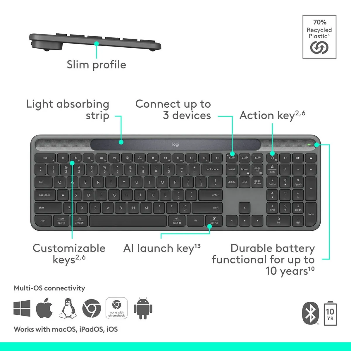 Experience the freedom of wireless with the Logitech Signature Slim Solar Keyboard. Powered by both solar and artificial light, this keyboard is designed for a hassle-free typing experience. With its sleek and durable design, it not only looks great on your desk but also offers functionality that adapts to your needs.