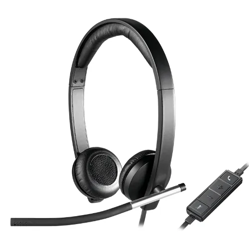 Logitech H650e USB Double-Ear Corded Headset:Double-ear stereo corded design is ideal for blocking off surrounding noise for laser-like focus during desktop callsCombines enterprise-audio quality with comfortable, stylish and intuitivenessIn-call LED red-light indicator located on backside of boomQuick-access in-line controller with volume-up button strategically built higher for point of referenceFlat no-tangle cordOptimized for Microsoft LyncCompatible with most leading UC platformsRotate boom up or down and bend it left or right to move it closer to mouthAutomatically switches between voice and music modes to deliver best sound qualityAcoustic echo cancelation and noise-canceling microphonePadded leatherette headband and earpads built with high quality materials for comfortIncludes cloth zipper bag