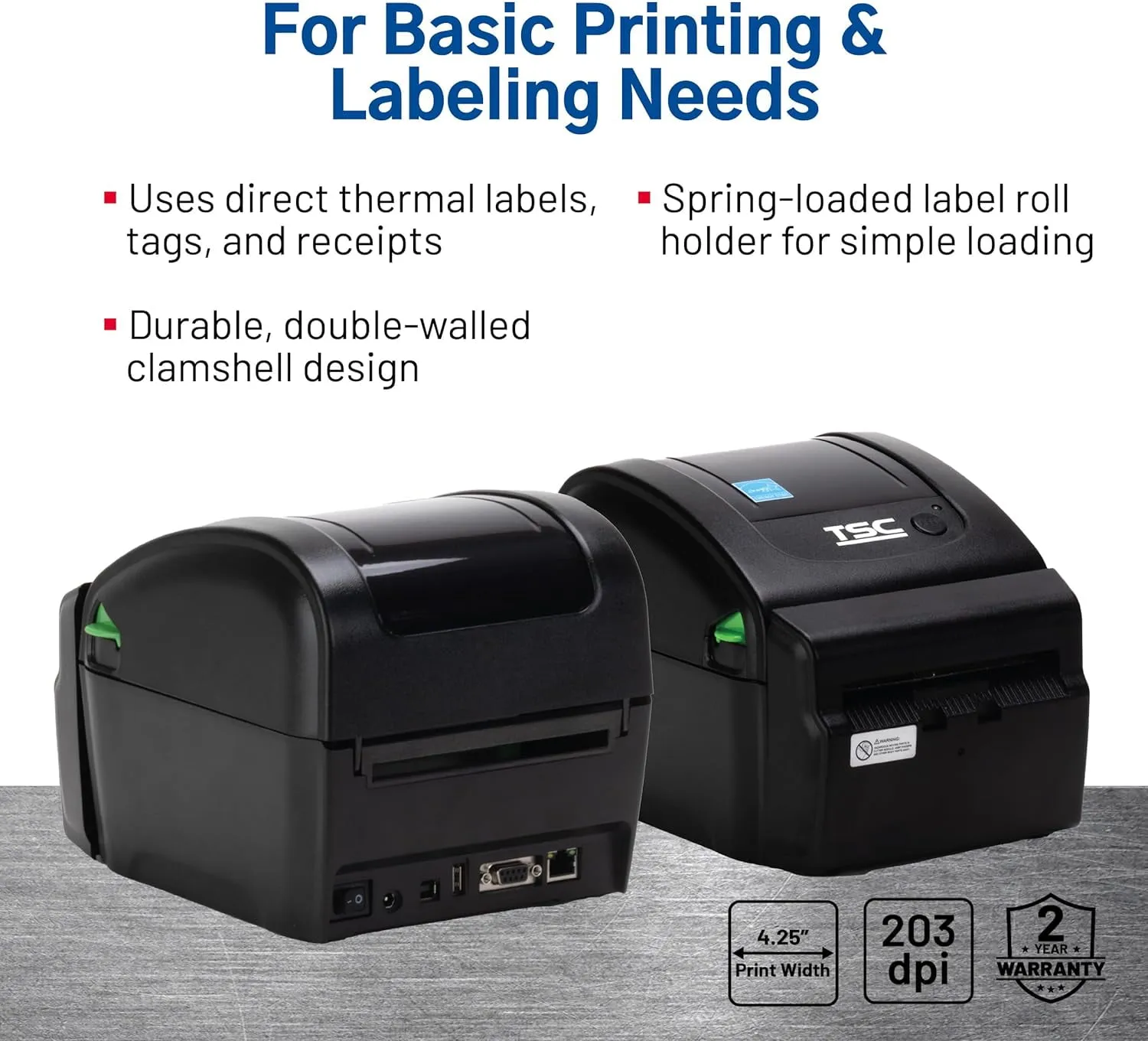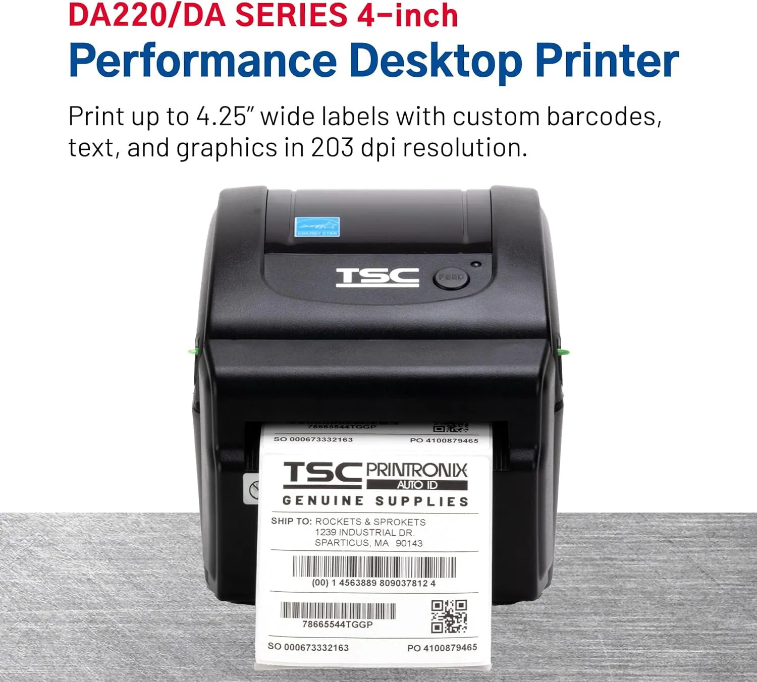 The TSC DA220 is a high-performance Direct Thermal Desktop Label Printer, designed for efficiency and versatility. With a print speed of 6 inches per second at 203 DPI resolution, it delivers crisp and clear labels with a print width of up to 4.25 inches.