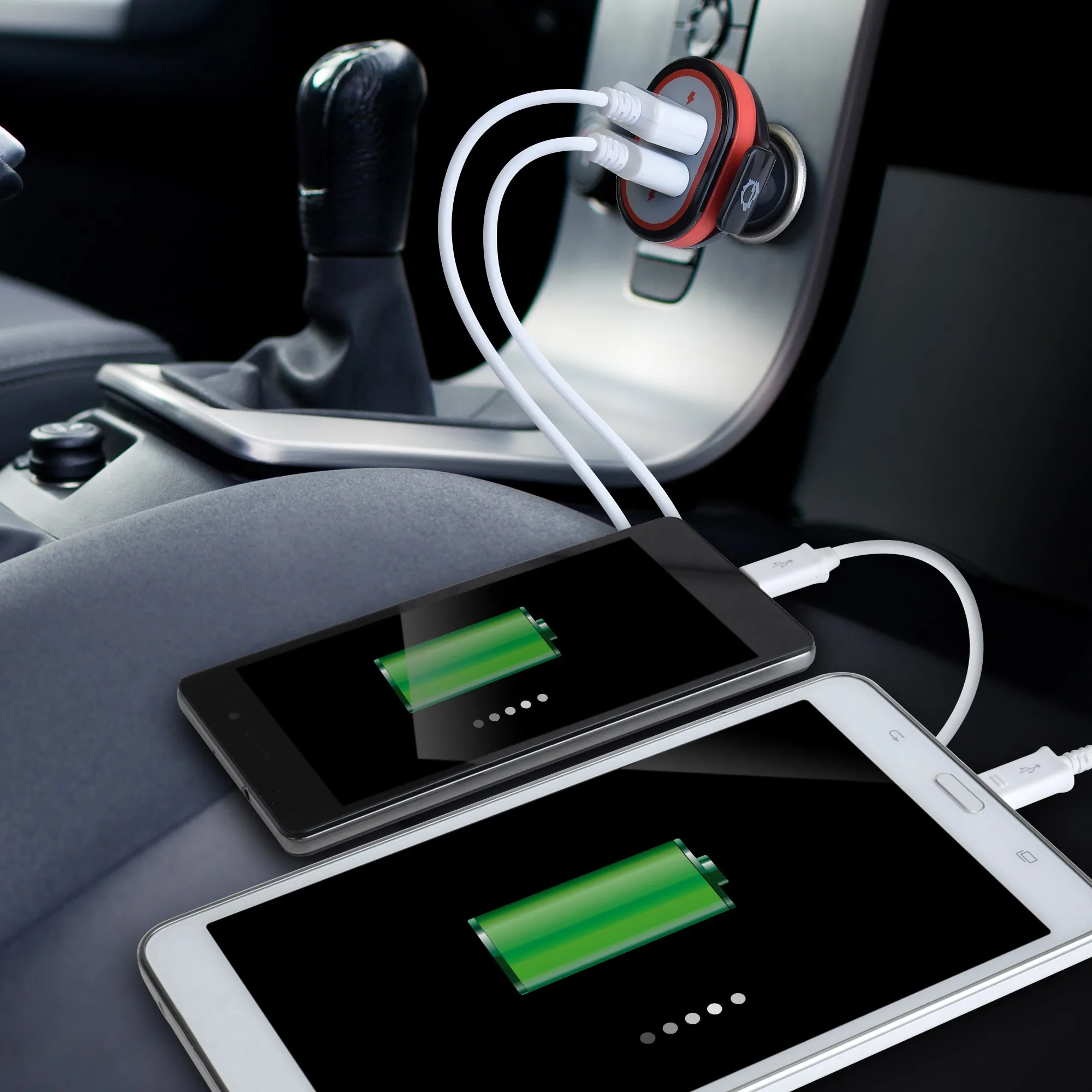 Input: DC 12V-24V Output: Total power output: DC 5V/3.4A (max) Per port: DC 5V/2.4A (max) Ports: 2, USB Type-A, Female, charging ports Color: Black/Red Environmental conditions: