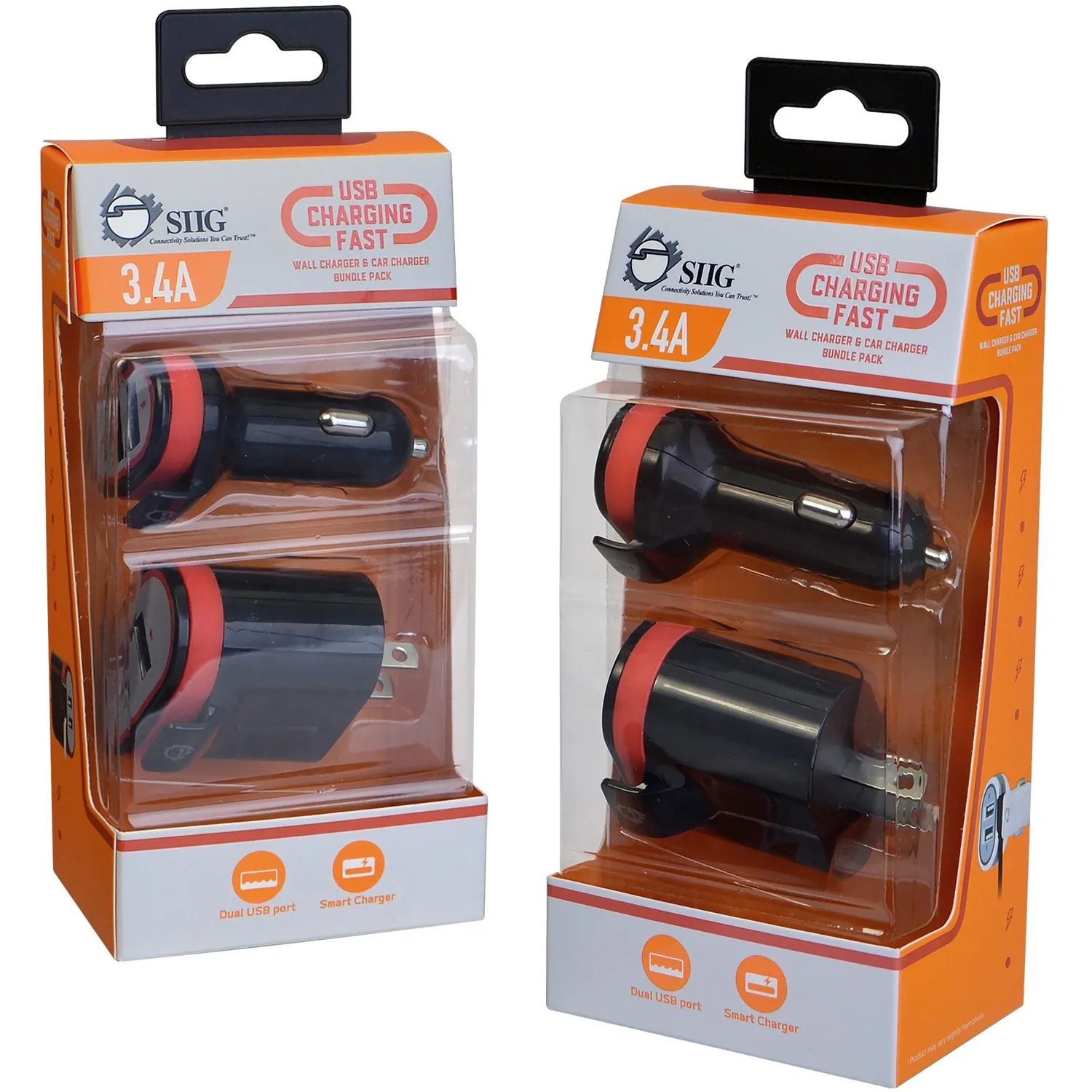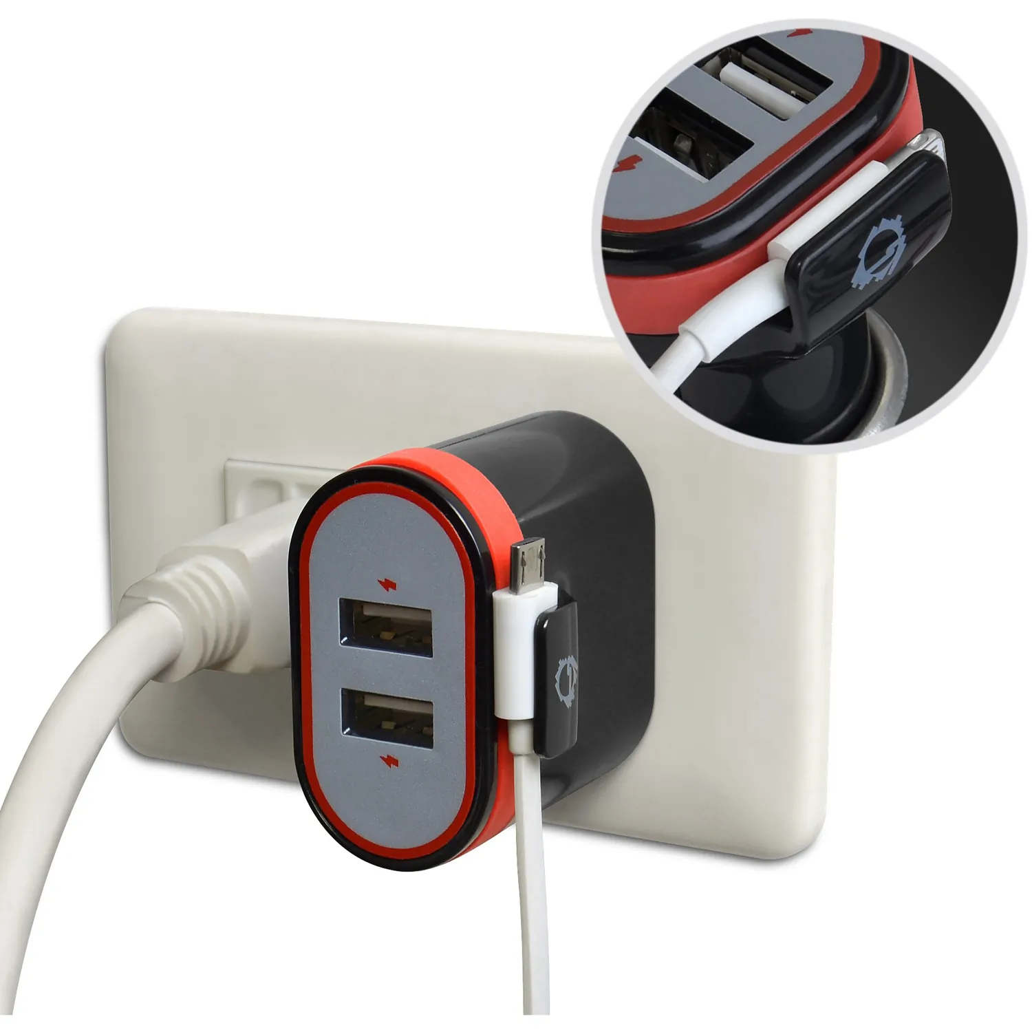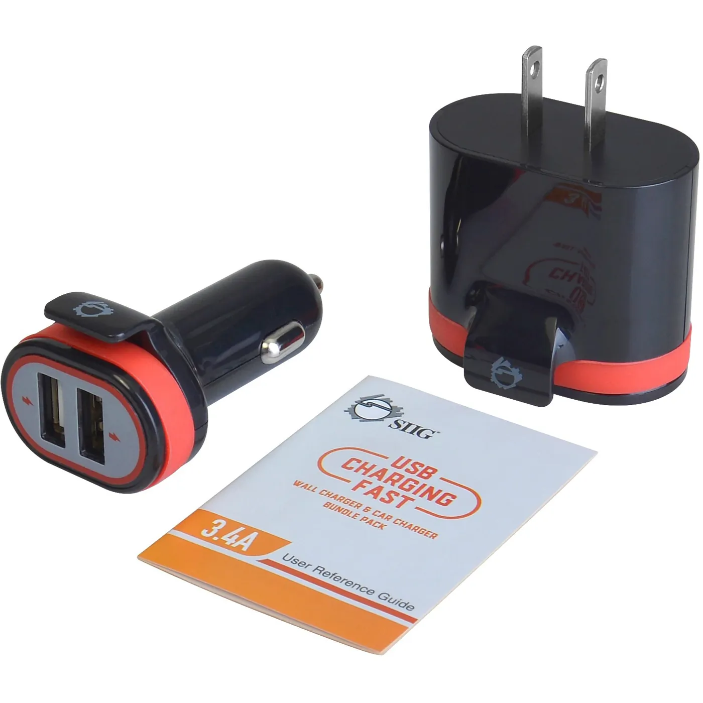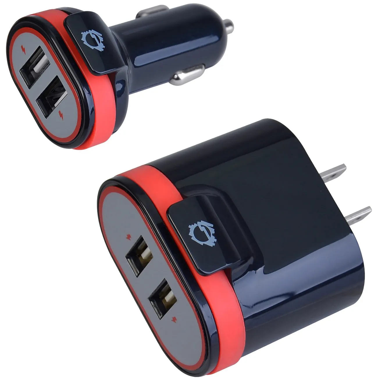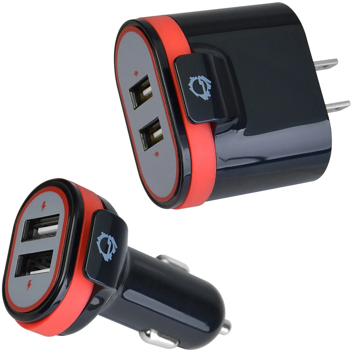Input: AC 100-240V, 50-60Hz Output: Total power output: DC 5V/3.4A (max) Per port: DC 5V/2.4 (max) Ports: 2, USB Type-A, Female, charging ports Color: Black/Red Car charger: