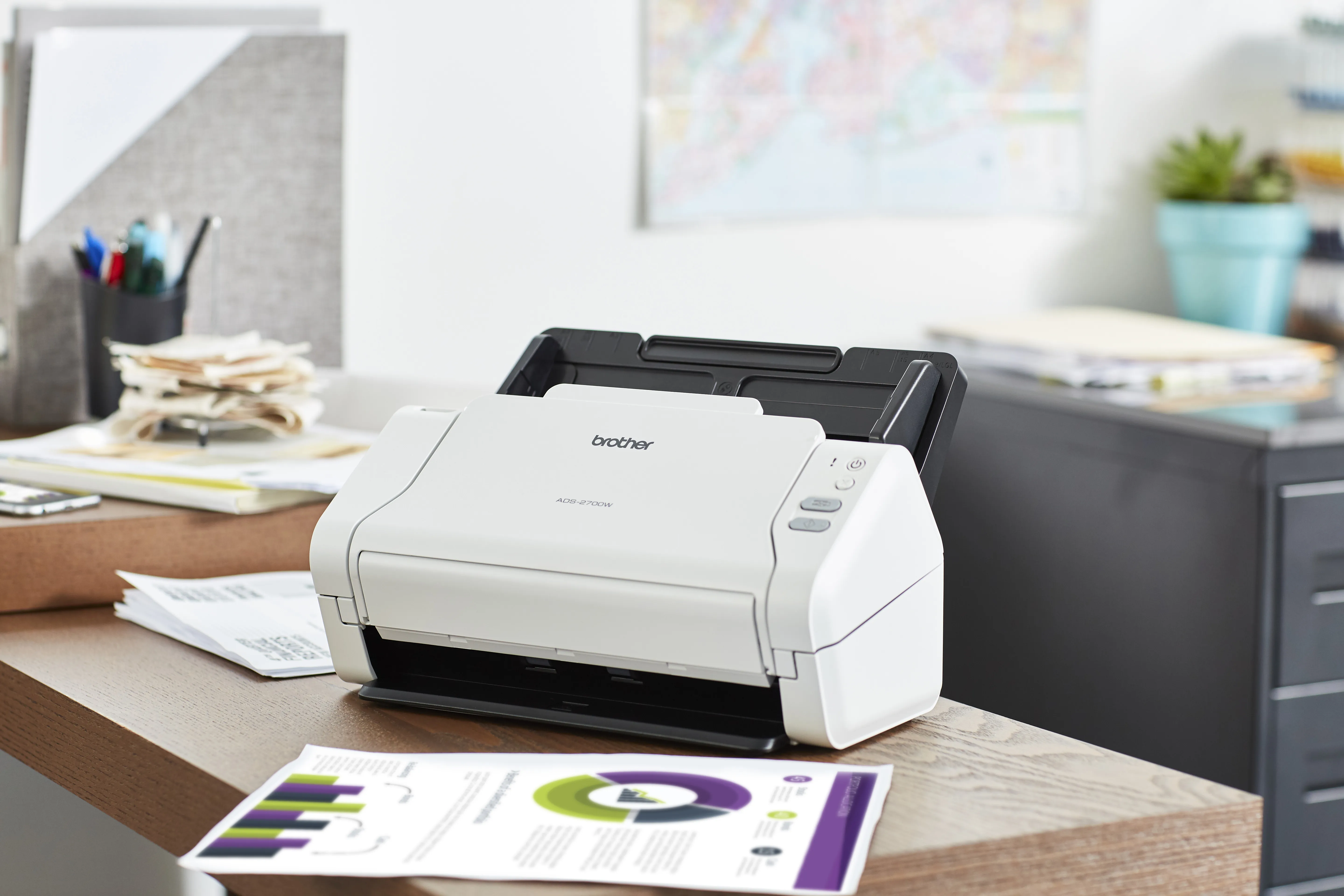 ADS-2700W Wireless High-speed Desktop Document Scanner offers fast and secure document digitization through wired/wireless networking and easy-to-use color touchscreen. It scans stacks of double-sided, color and Black & White materials up to 35ppm&Dagger in a single pass with its 50-page capacity auto document feeder and offers continuous scanning of additional pages. Its unique space-saving design accommodates smaller workspaces and security features support controlled scanner access by individual/scanning function and secure network protocols. The ADS-2700W scans to multiple destinations including File, Image?, OCR, Email, Network, USB flash drive, and mobile devices, is compatible with Windows, Mac and Linux and TWAIN/SANE/WIA for PC drivers.
