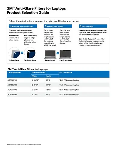 Anti-glare filter for your 12.5" wide-screen laptop helps protect your screen and improve your view in indoor bright or challenging lighting conditions. Enjoy a clear screen in brightly lit indoor areas, even near windows. Amazing optical technology from 3M diffuses mirrorlike reflections to help keep what's on your screen clear and visible while providing a layer of protection from dust and scratches. Matte surface cleans easily and hides fingerprints. Scratch-resistant filter attaches with optically clear adhesive strips or easily removable, slide-mount tabs. Lightweight, thin, frameless design features touch-compatibility and a 16:9 aspect. View area dimensions are 10-15/16" x 6-1/8" (277mm x 156mm).