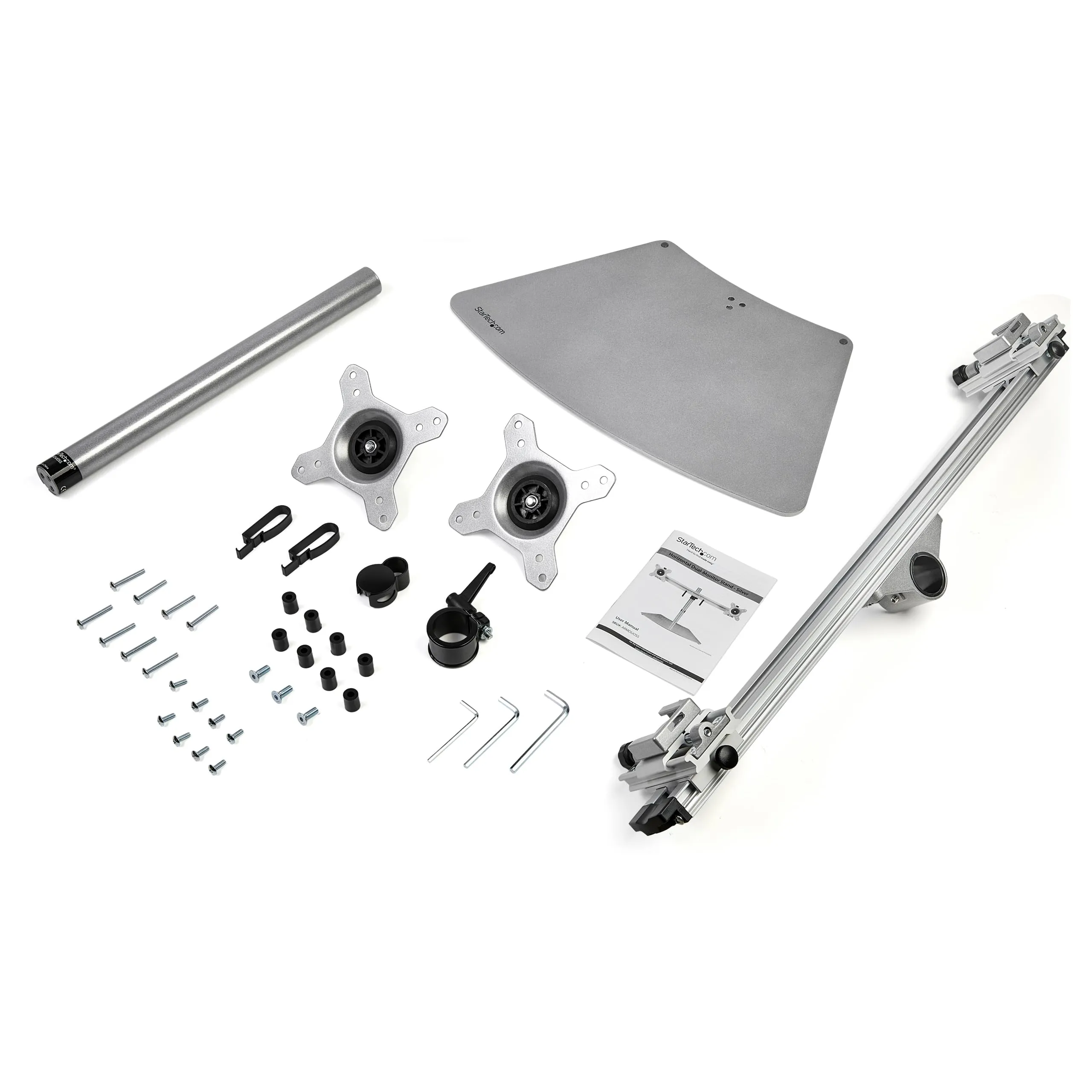 Dual-Monitor Stand, Horizontal - Save desk space and enhance productivity by mounting two monitors in horizontal position with this dual-monitor stand - Supports VESA monitors up to 24" - Free-standing dual monitor mount with crossbar design keeps monitors aligned - Low-profile base sits closely to the wall - Silver finish - Double computer monitor stand with easy height adjustment along the pole and +/-15 degree tilt - Robust steel and aluminum twin monitor stand supports a weight capacity of 18 lb (8 kg) per monitor .