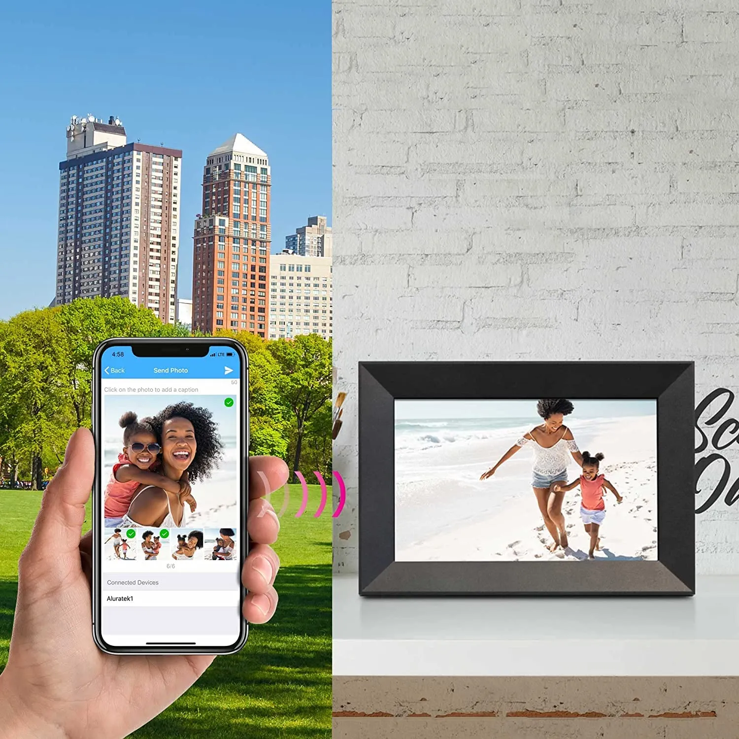 Transform your favorite memories into a stunning visual display with the ALURATEK 10" WiFi Digital Photo Frame. This frame features a vibrant touchscreen that allows you to easily navigate through your photo collection.