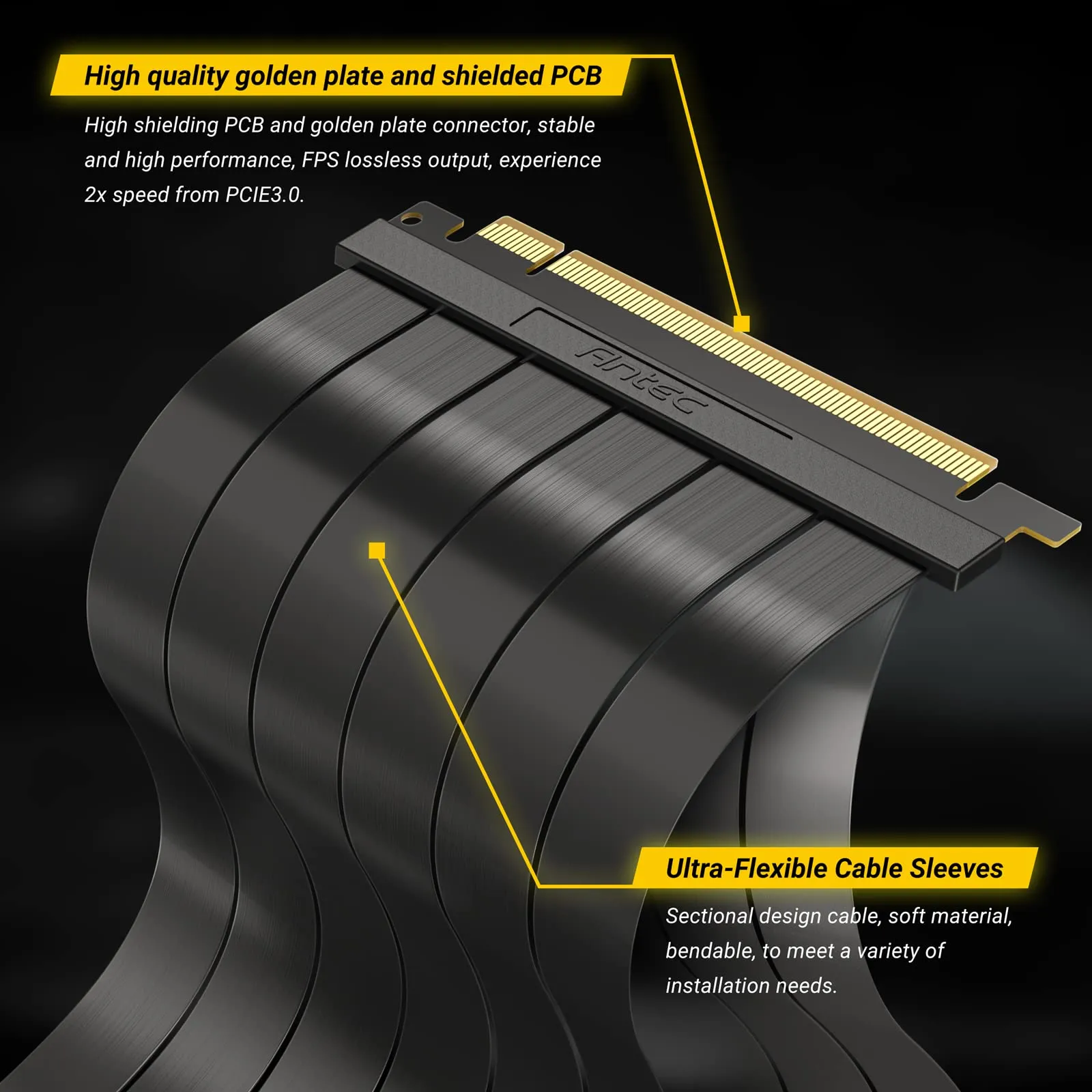 The Antec PCI-E 4.0 Riser Cable is designed for high-performance GPUs, providing a reliable connection for your RTX 4090, RTX 4070 Ti, and RX 6950 XT graphics cards. This 200mm flexible extender features a 90-degree adapter for easy installation in tight spaces, allowing your hardware to perform optimally.