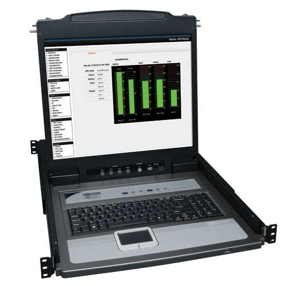 Tripp Lite's 16-port Console KVM Switch w/19" LCD is the optimal solution for controlling multiple computers from one keyboard, mouse and monitor. This single unit combines a 16 port KVM switch, keyboard, 19" LCD monitor and touchpad; all in a mere 1U of rack space. Stores neatly in the rack, pulls out when needed. Control up to 512 computers from this single console by daisy-chaining additional B022-U16 16 port KVM switches. Easily switch ports using the On-Console push buttons, On Screen Display (OSD) or keyboard hot key commands. Includes eight, six foot Combo cable kits, which allow connection to either PS/2 or USB only servers...no adapters needed. Also features an extra HD15 and (2) PS/2 ports on the rear of the unit, which allows for connection of a Tripp Lite B051-000 IP Remote Access Unit or an external console. Two USB ports are provided on the front of the unit: One for attachment of a separate USB mouse, and one for attachment of USB peripherals, such as a flash drive, external hard drive, etc.
