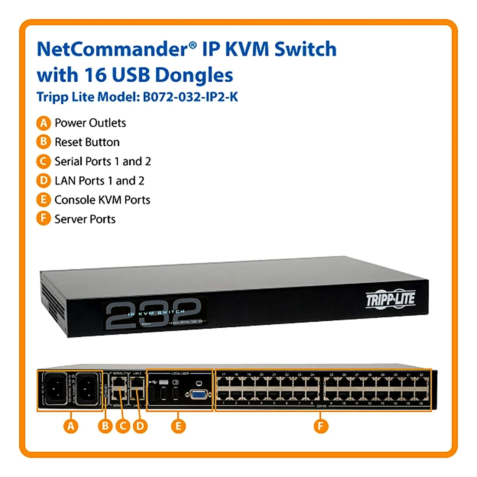 Tripp Lite 32-Port Cat5 IP KVM Switch 1 Local 2 Remote 16 USB Dongles Rackmount - 32 Computer(s) - 1 Local User(s) - 2 Remote User(s) - 1920 x 1080 - 36 x Network (RJ-45) - 2 x USB1 x VGA - Rack-mo