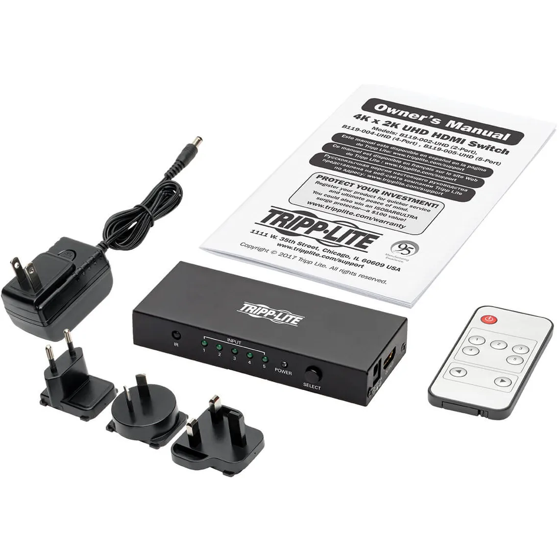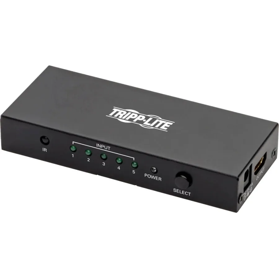 5-Port HDMI Switch with Remote Connects 5 Sources to One 4K HDMI Display An excellent addition to your home theater, the B119-005-UHD allows you to connect five separate HDMI audio/video sources to your 4K television, projector or monitor?s HDMI input and switch between them. For instance, connect a cable box, Blu-ray player, Xbox, Roku and audio receiver to your 4K HDTV, and use the included remote control to switch manually from one input to another.Transmits Crystal-Clear Video up to 4K x 2K for Ultra High Definition Presentations This 5-port HDMI switch with remote ensures UHD performance with video resolutions up to 3840 x 2160 (4K x 2K) @ 60 Hz and 48-bit True Color (16 bits per channel), as well as DTS-HD, Dolby TrueHD and 7.1-channel surround sound audio. It meets 3D, HDMI 2.0, HDCP 2.2 and EDID standards. Switch between source devices using the unit?s Select button or the remote control.Ready to Use Right from the Package, So You Can Plug and Play Immediately The compact metal switch requires no software or drivers to download and install. Connect your devices to the HDMI ports with user-supplied HDMI cables (such as Tripp Lite?s P569-Series), and plug the included external power supply into an AC power source. A red LED indicates the unit is receiving power, and green LEDs indicate connected HDMI inputs. When the currently used source is powered off, the unit automatically switches to the next powered-on source.Product Type Audio/Video SwitchboxConnectivity Technology CableNumber of Input Devices Supported 5Device Supported Display Home Theater System ProjectorNumber of Displays Supported 1Video Graphics Modes 4K Maximum Video Resolution 3840 × 216Interfaces/Ports HDMI In Yes HDMI Out Yes Number of HDMI Inputs 5 Number of HDMI Outputs 1Height 0.8"Width 4.8"Depth 2"Weight (Approximate) 0.15 kgPackage Contents B119-005-UHD 5-Port HDMI Switch with Remote - 4K x 2K UHD @ 60 Hz Remote Control External Power Supply (Input: 100?240V, 50/60 Hz, 0.3A; Output: 5V 1A) 4 x International Plug adapters (North America, Europe, United Kingdom, Australia) Owner?s ManualEnvironmentally Friendly YesEnvironmental Certification RoHS REACH