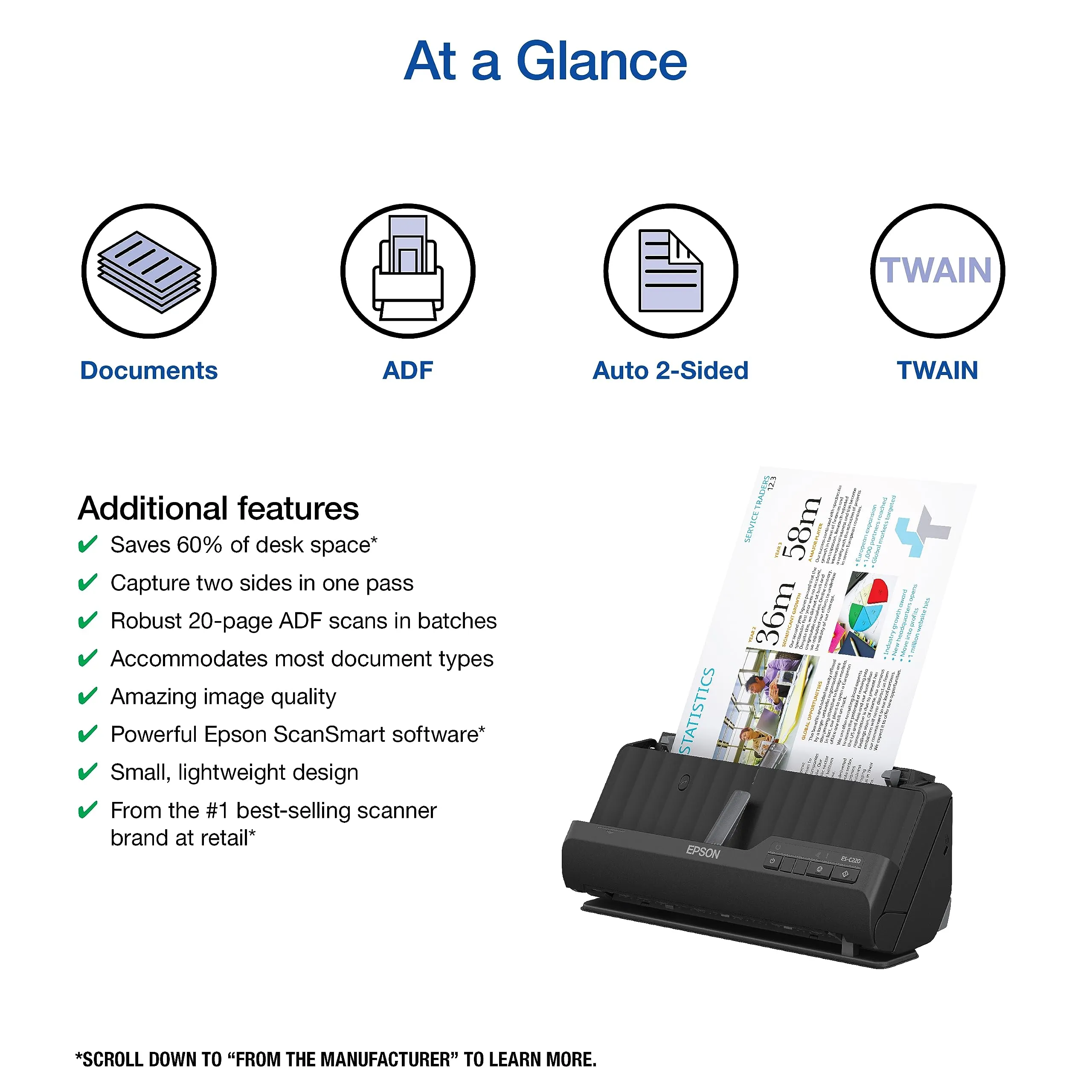 The Epson Workforce ES-C220 is a compact and efficient desktop scanner designed for quick and easy scanning of receipts, documents, and images. With its wireless connectivity, you can scan directly to your computer or mobile devices without the hassle of cables. Ideal for both home and office use, the ES-C220 offers high-quality scans with a range of features to improve your productivity.