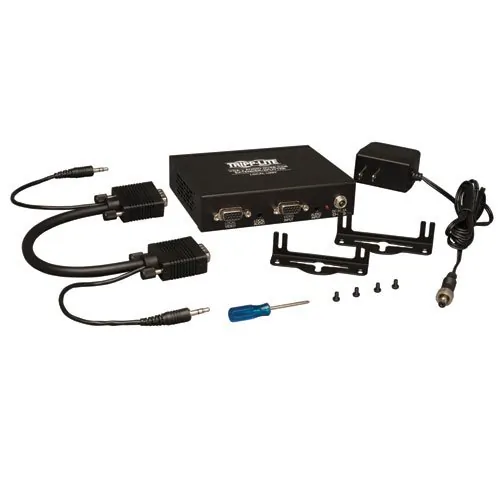 Splits a single VGA and Audio signal into five (1 local, 4 remote).Increase the number of displays to up to 25 (1 local, 24 remote) by daisy-chaining up to six units together.Ideal for digital signage situations, such as retail, schools, churches, etc.EDID copy feature ensures optimal display compatibility.Support for video resolutions up to 1920 x 1440 (60Hz).Includes mounting hardware that allows unit to be wall-mounted, rack-mounted or pole-mounted.Model Number: B132-004A
