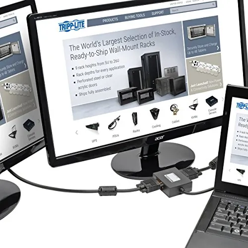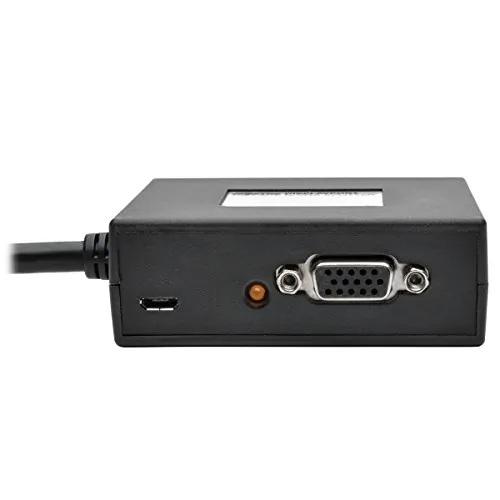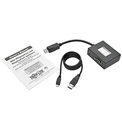 2-Port DisplayPort to VGA Splitter:Supports video resolutions up to 1920 x 1080 at 60HzIncluded USB micro-B cable supplies power to unitWorks with all operating systemsCompact enough for easy carrying in backpack or laptop bagPlug and play, no software or drivers requiredIdeal for offices, conference rooms, trade shows and classroomsBuilt-in DisplayPort cable connects to sourceSave money on new DisplayPort displays or docking stationsComplies with HDCP, EDID and DDCLEDs indicate whether splitter is powered on and transmitting signal to connected displaysIncludes:B157-002-VGA 2-Port DisplayPort to VGA SplitterUSB micro-B cable, 3'Owner's manual