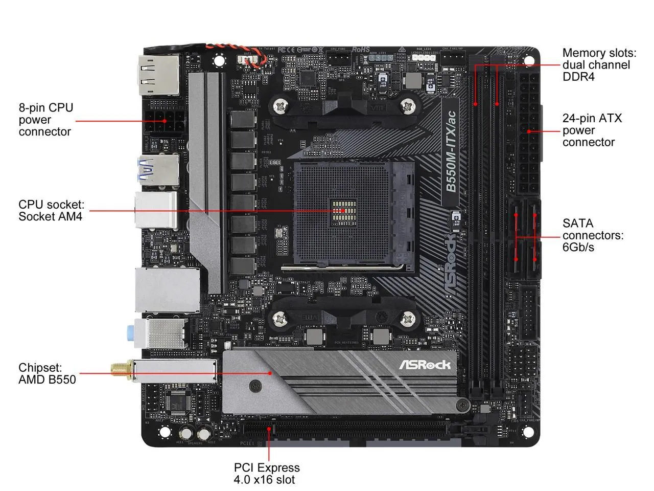 The ASRock B550M-ITX AC is a compact Mini ITX motherboard designed for AMD Ryzen processors, offering superior performance in a small form factor. It supports high-speed SATA 6Gb/s and is equipped with dual-band Wi-Fi, making it an excellent choice for gaming and productivity.