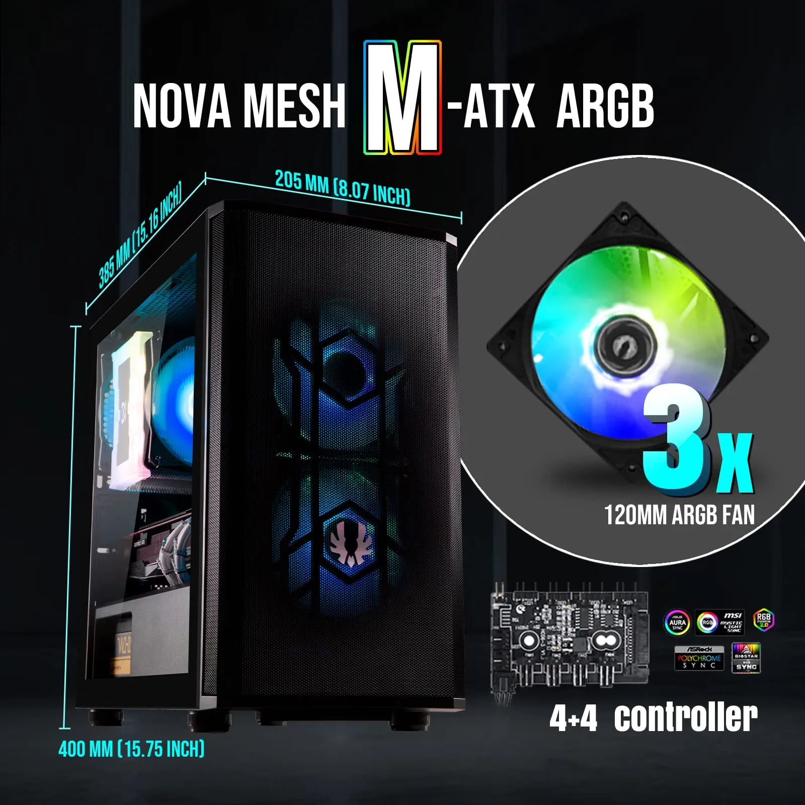 The BitFenix Nova Mesh ARGB edition is the perfect case for gamers seeking a balance of aesthetics and performance. Designed for Micro ATX and Mini ITX motherboards, this case features a high airflow design with a striking mesh front panel, ensuring optimal cooling for your components. The case comes pre-installed with three addressable RGB fans that can be easily controlled for a vibrant gaming setup.