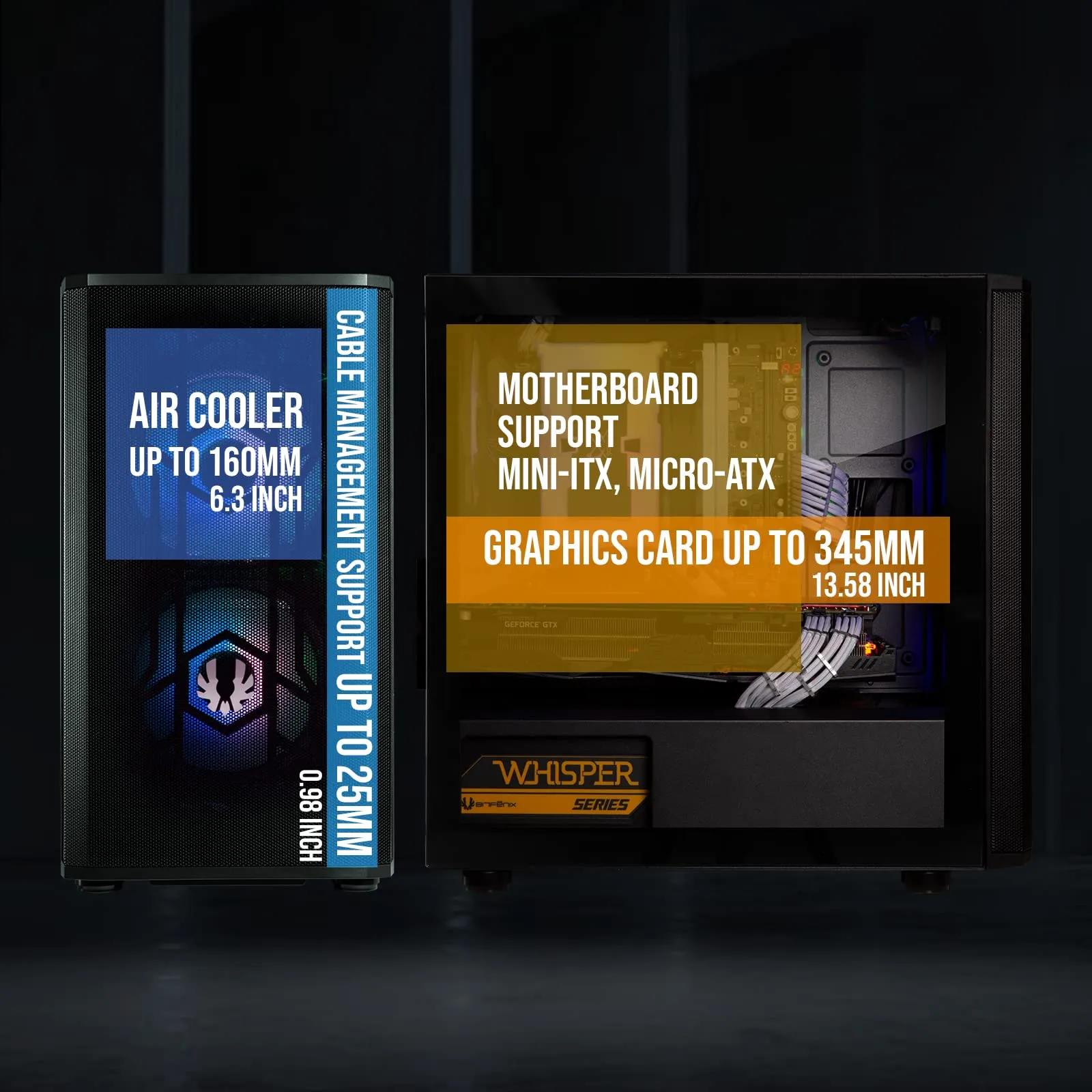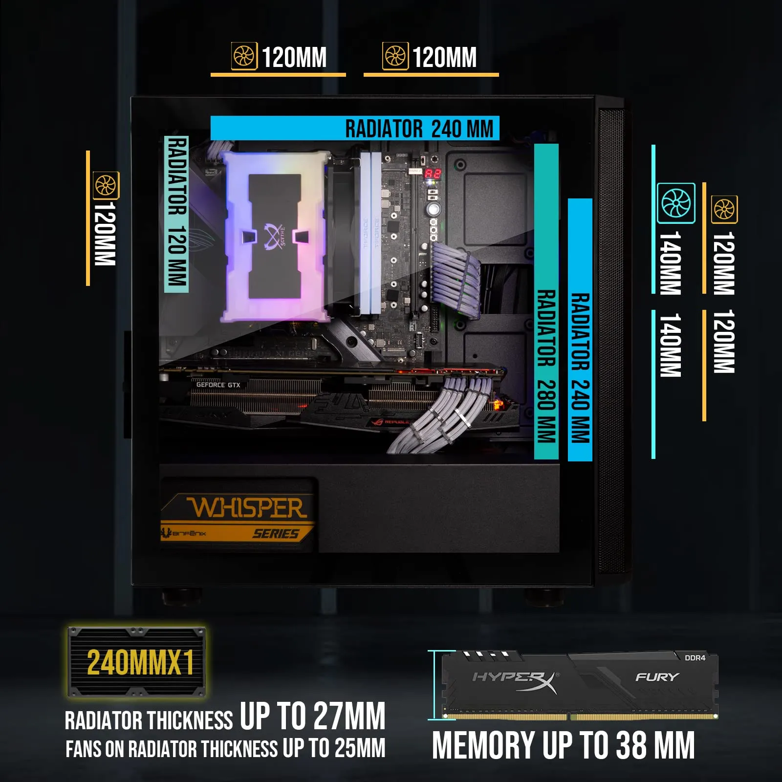Accommodating up to 345mm GPUs and supporting a 240mm AIO at the top, this case offers flexibility for high-performance builds. The spacious interior and cable management options make installation straightforward and clean. Ideal for both beginner and enthusiastic builders, the Nova Mesh ARGB case is where style meets functionality.